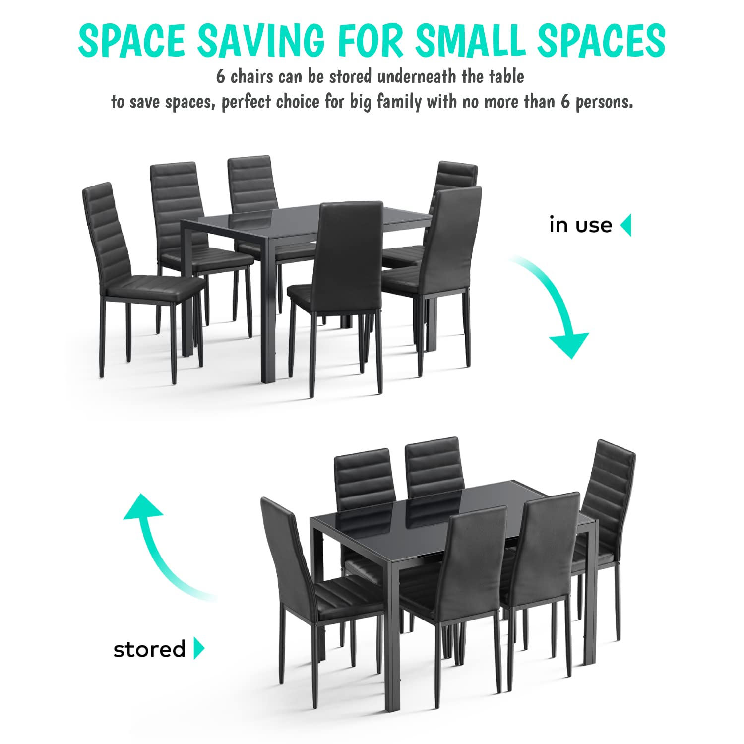 Gizoon Glass Dining Table Sets for 6, 7 Piece Kitchen Table and Chairs Set for 6 Person, PU Leather Modern Dining Room Sets for Home, Kitchen, Living Room