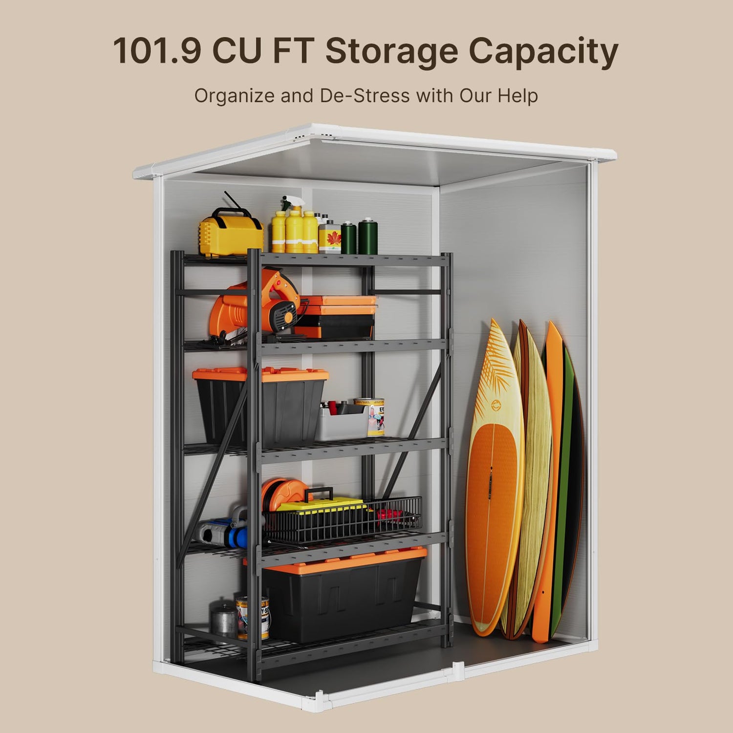- 【Spacious Storage Space】This 5X3 FT outoodr storage shed offers a generous 101.9 cubic feet of storage space, making it ideal for families who love outdoor activities. Easily store your grill, bicycles, lawn chairs, and more. Whether preparing for a family gathering or managing outdoor equipment, it keeps your yard neat and orderly. Meeting Diverse Storage Requirements with Flexibility