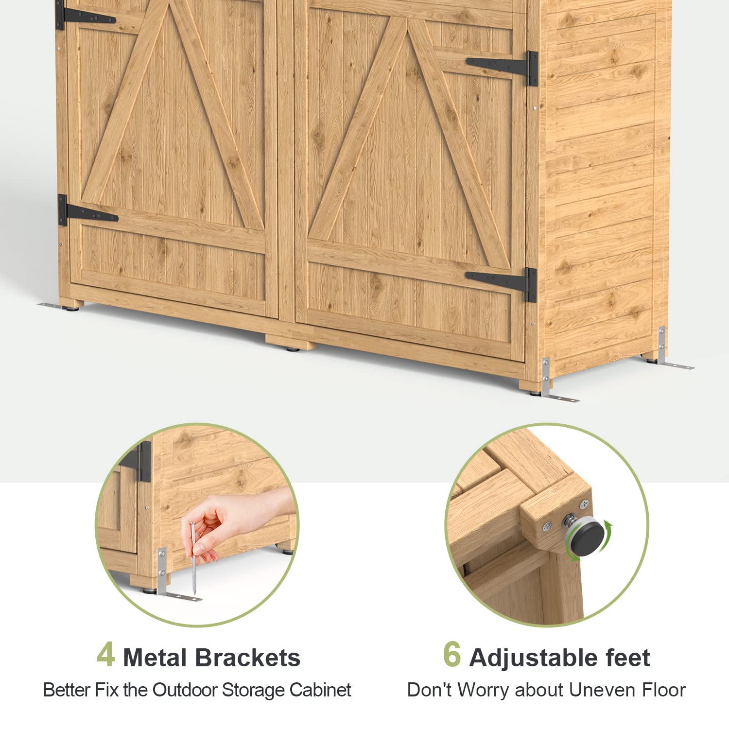 Focus on Details: Lockable Doors: The outdoor storage cabinet with sliding metal locks can effectively keep all your garden supplies secure. Powerful Magnets: This storage shed is equipped with magnetic devices on the top and bottom corners of the door, which is more conducive to closing the door, you just need to gently close the door. 2 metal handles: The door handle is made of high-quality metal, and is resistant to rust, which brings convenience to opening and closing the doors. 8 black metal hinges: This storage shed has 8 reinforced fixed metal hinges, making this wood shed more durable and stable, and having longer service life outdoors. 4 metal brackets: Metal brackets can better fix the storage shed, even in windy weather, the shed can also stand firmly. 6 Adjustable Feet: The adjustable base allows the tool shed to be used in uneven areas, making the patio storage cabinet more stable and not tilted.