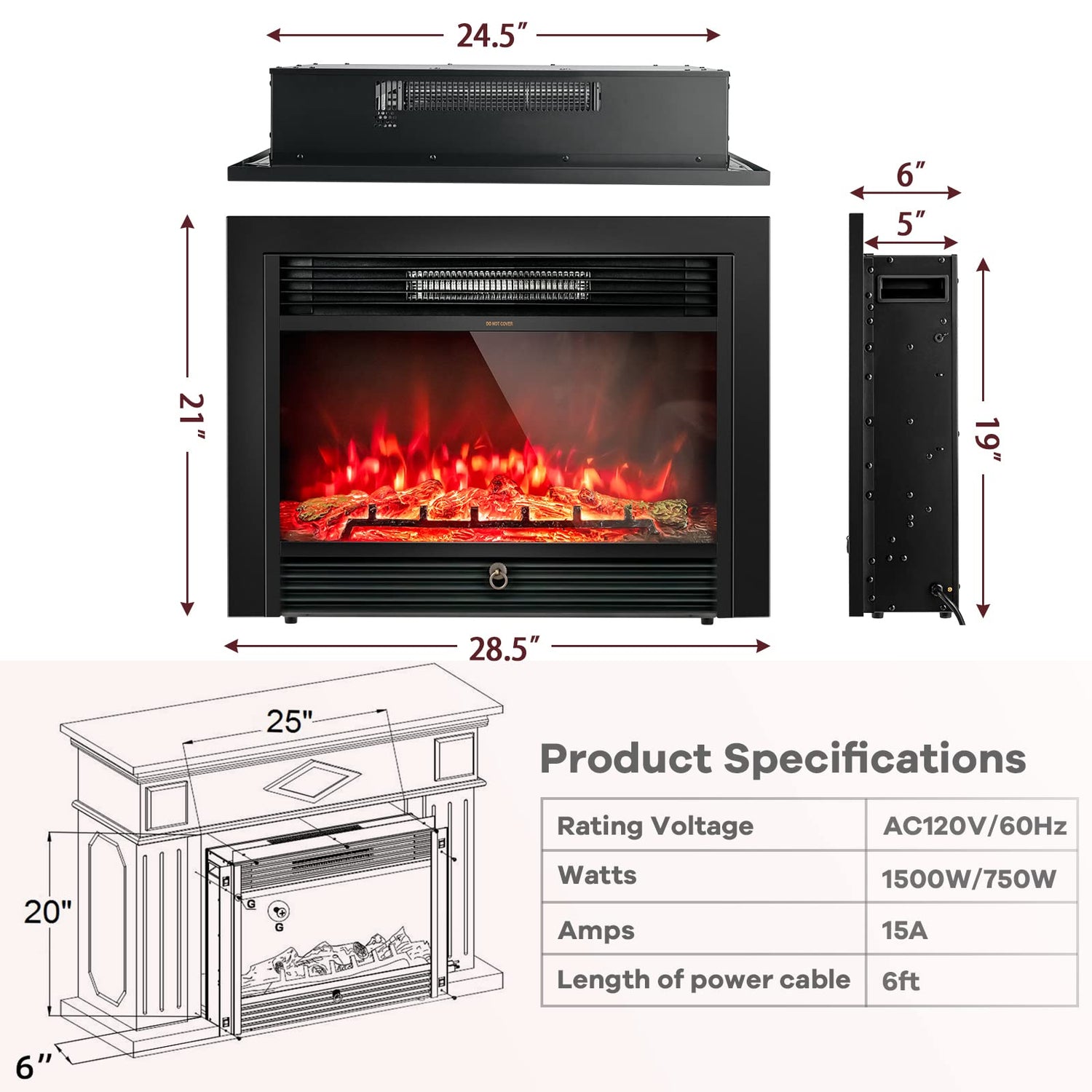 - Multiple Installation Methods: This 28.5” x 21” x 6” electric fireplace heater is the perfect size for most family, you can put it into your DIY stone wall, let it directly recessed into the existing mantel or just place it on the cabinet. It will save space and offers a traditional style with coziness.