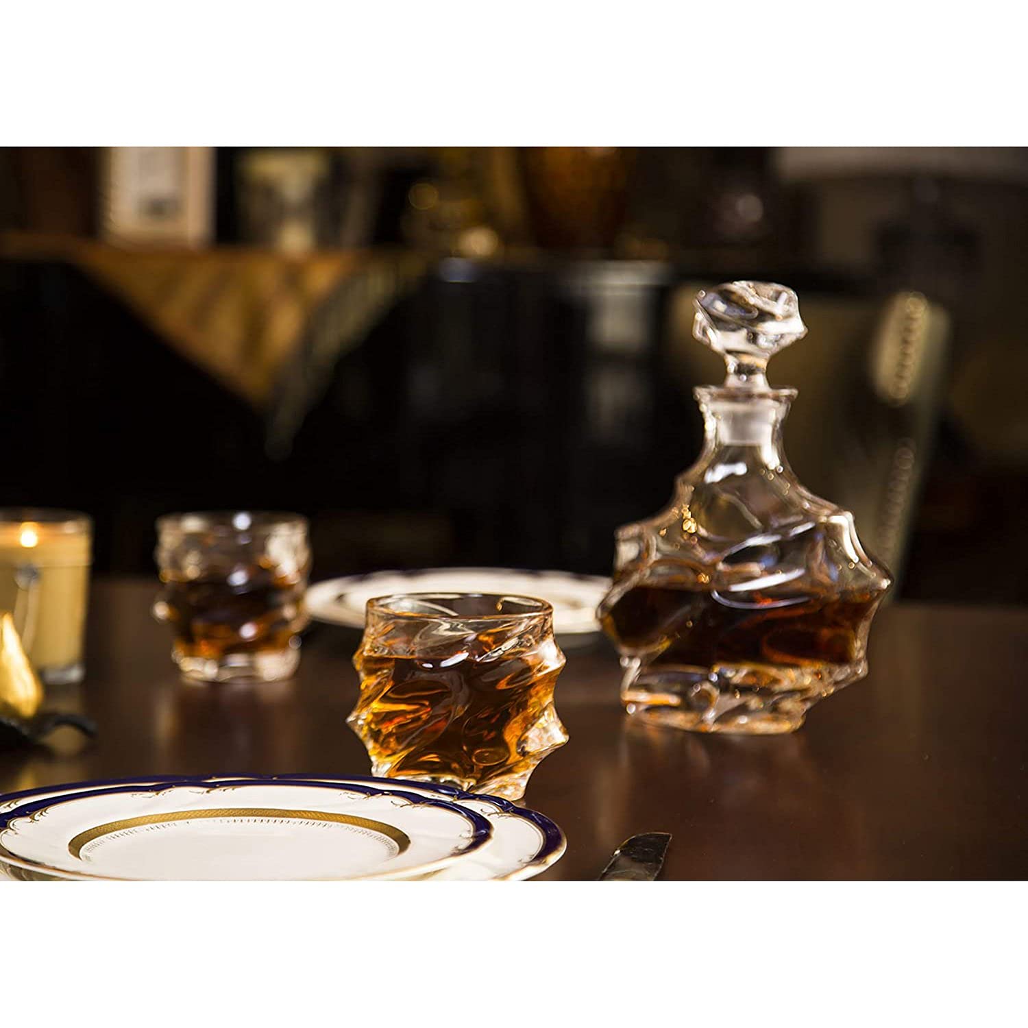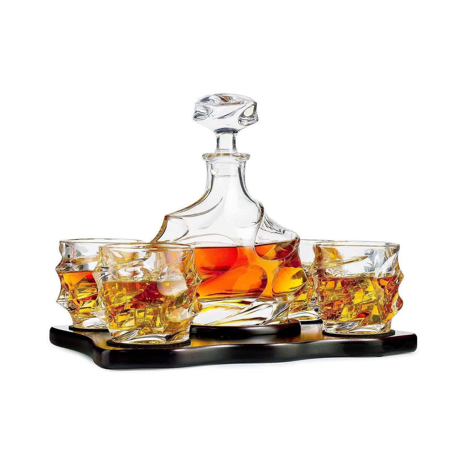 - BEAUTIFUL DECANTER SET ON WOOD HOLDING TRAY: With handcrafted curves, this limited edition Mountain Whiskey Decanter set will prove to be the stand-out object in any room you place it in. The asymmetry and new design in this series creates a fantastic centerpiece and conversation starter.