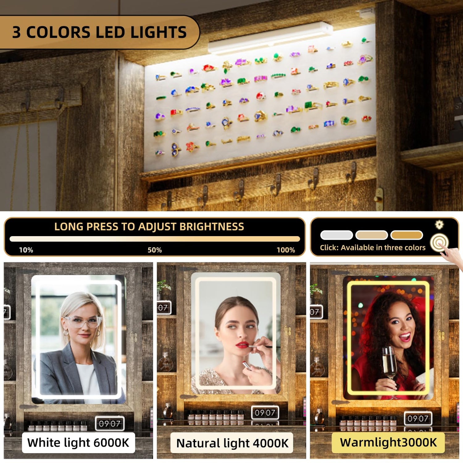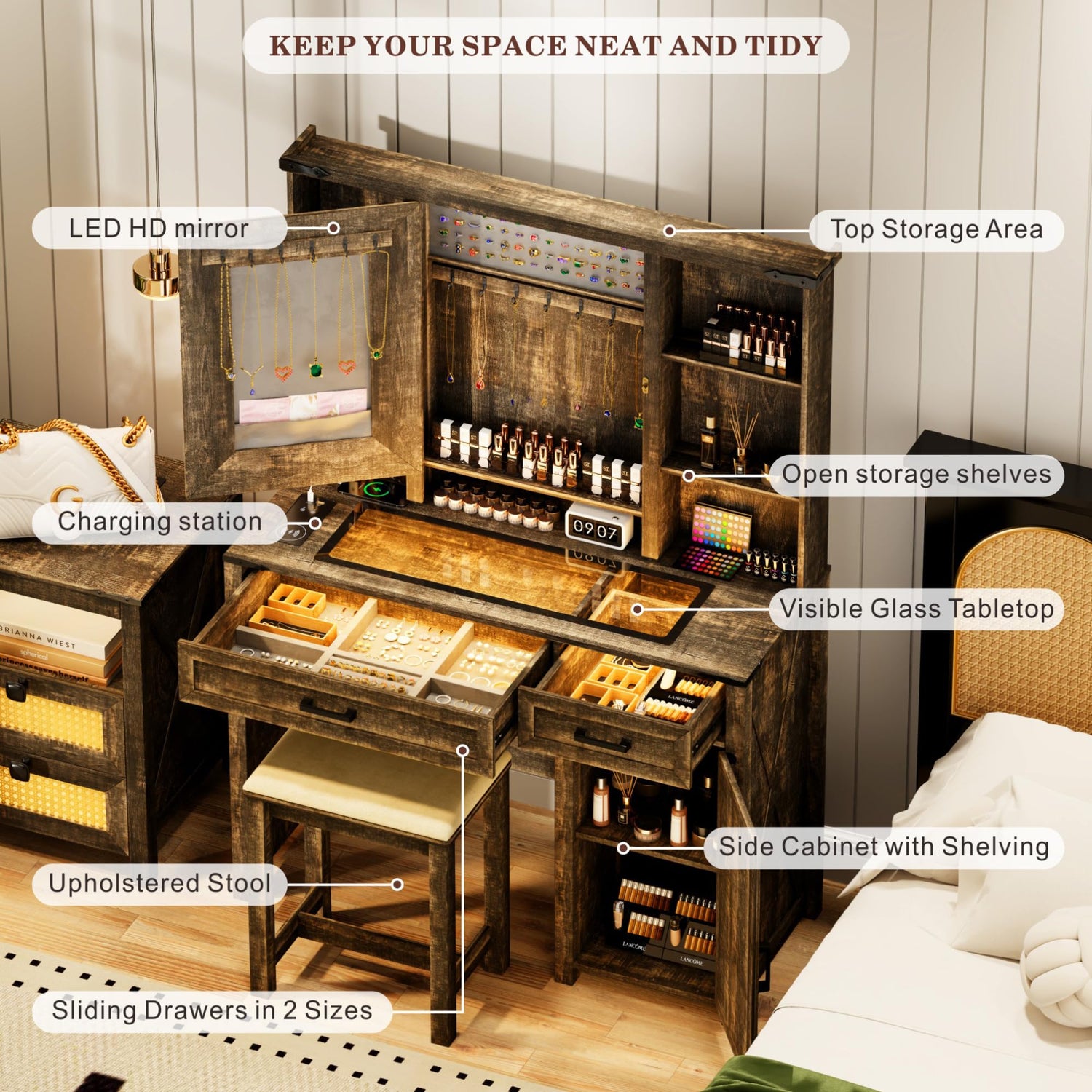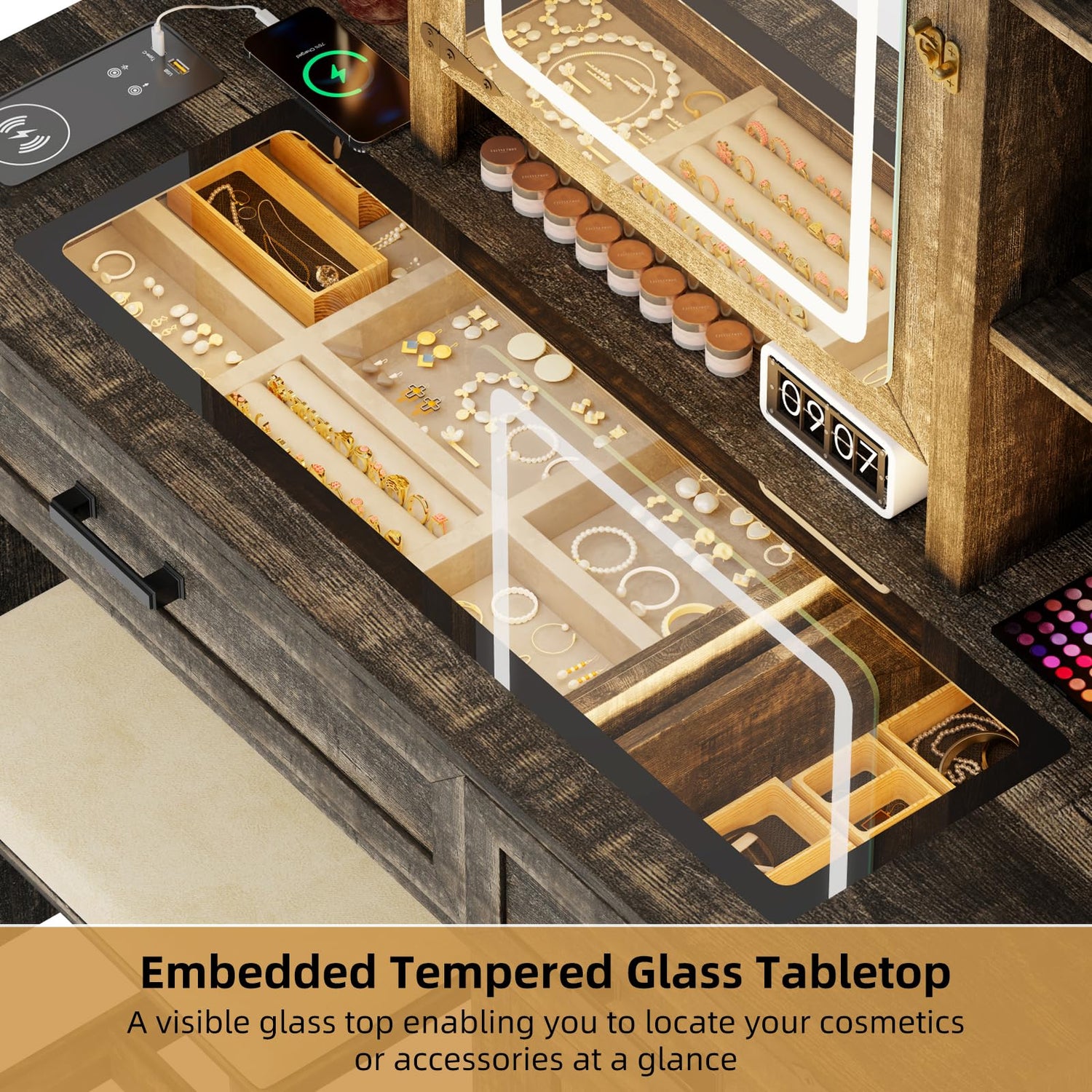 GlasFlength Farmhouse Makeup Vanity Desk with Mirror & Light, 40'' Glass Tabletop Vanity Table with 2 Drawers & Hidden Jewelry Cabinet, Rustic Big Vanity Charging Station Set, Stool Included, Bedroom