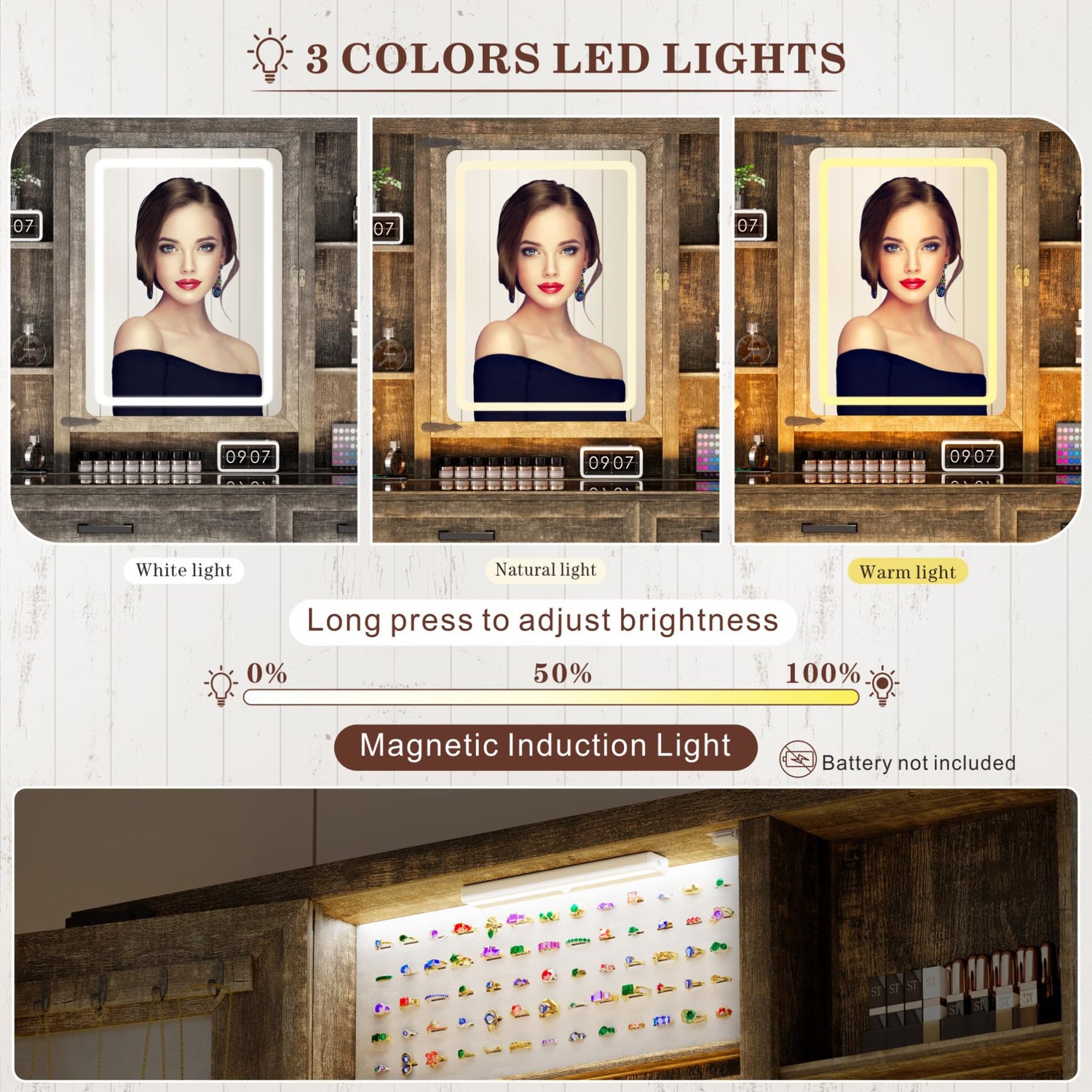 - BRIGHTNESS ADJUSTABLE LED LIGHTS: Dressing table comes with human sensor 3 color LED lights, brightness 0%-100% adjustable to meet different requirement. Makeup desk with intelligent 360° human sensor design, light turn on automatically once detects human within 1M approx