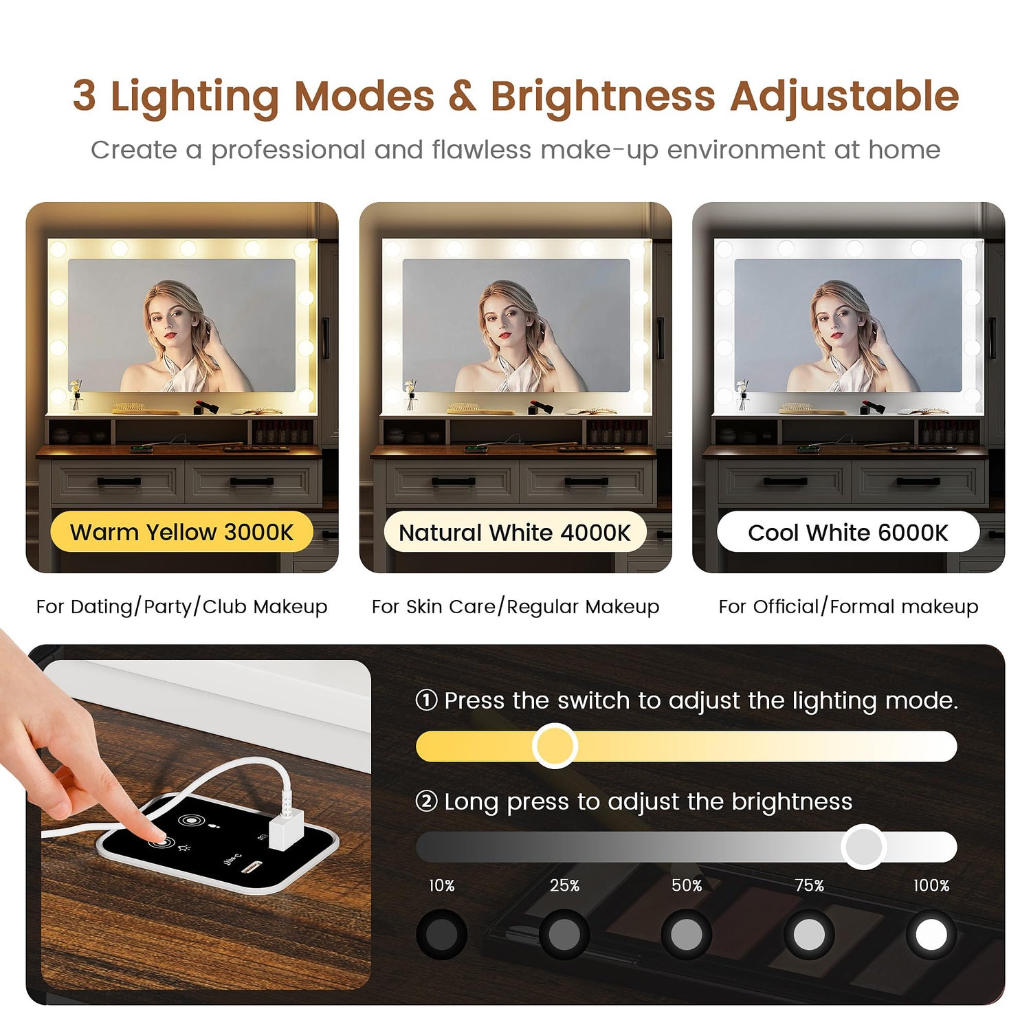 - 3-Color LED Lights: Equipped with adjustable 3-color LED lights, this vanity cabinet allows you to customize the lighting for different tasks, from soft ambient to bright makeup lighting, ensuring the perfect glow for every occasion