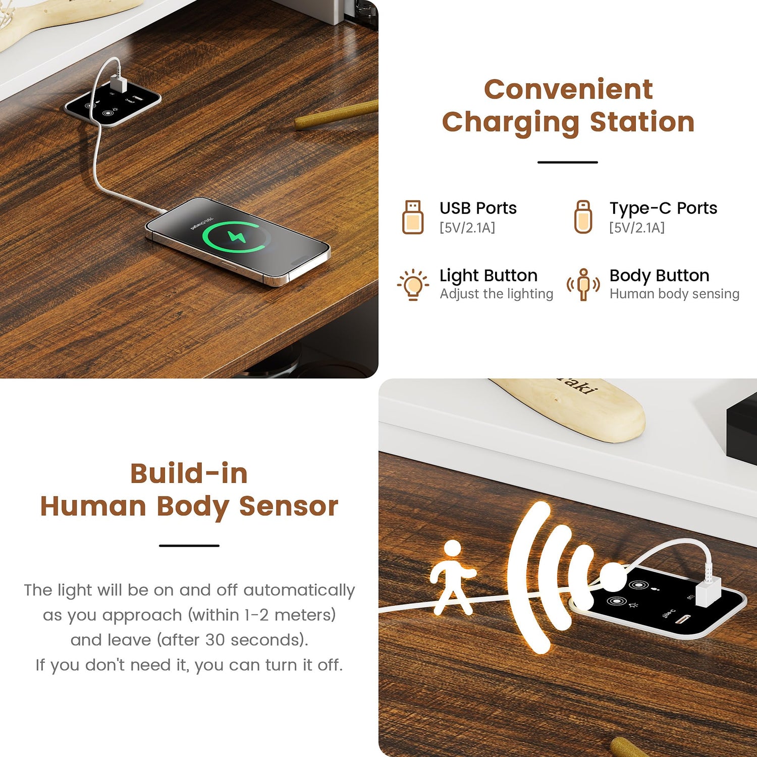 - Advanced Human Body Sensing Lighting System:The vanity desk is equipped with an intelligent lighting system that automatically responds to your presence. As you approach the desk, the lights softly illuminate, creating a perfect glow for your makeup or self-care routine. Once you step away, the lights turn off, saving energy and ensuring convenience