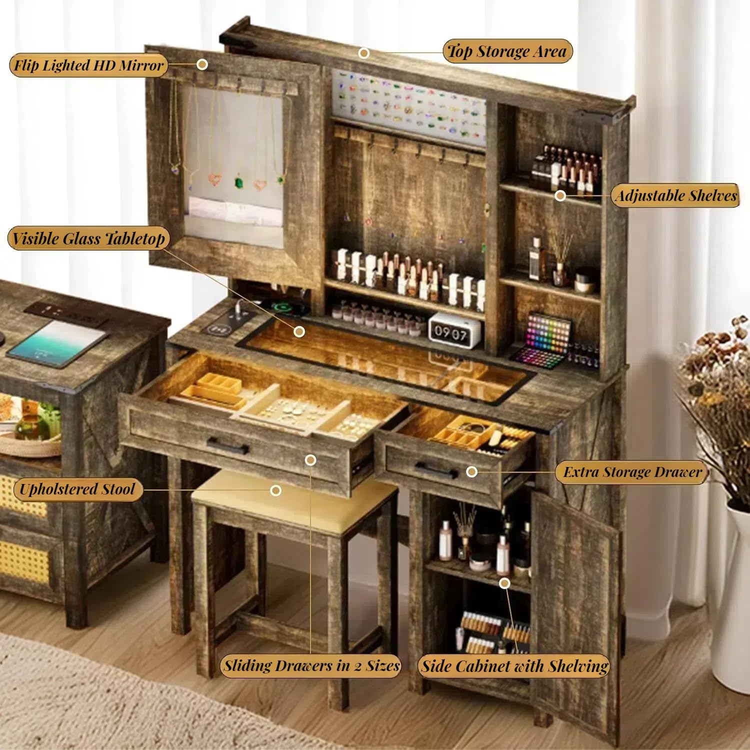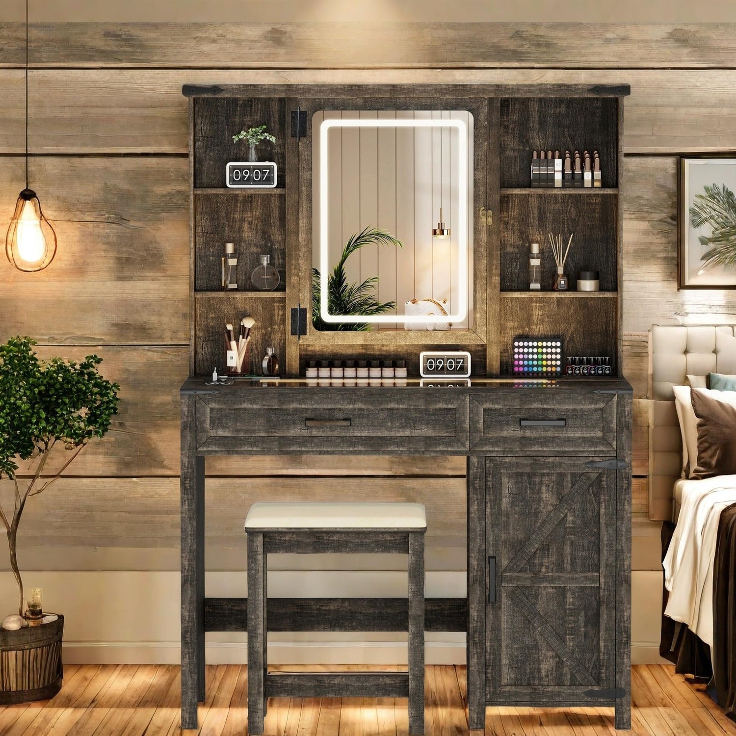 - Charging Station: The farmhouse-style makeup table is equipped with a 1x USB port, 1x Type-C port, and a wireless charging station, allowing you to easily charge your devices without searching for an outlet
