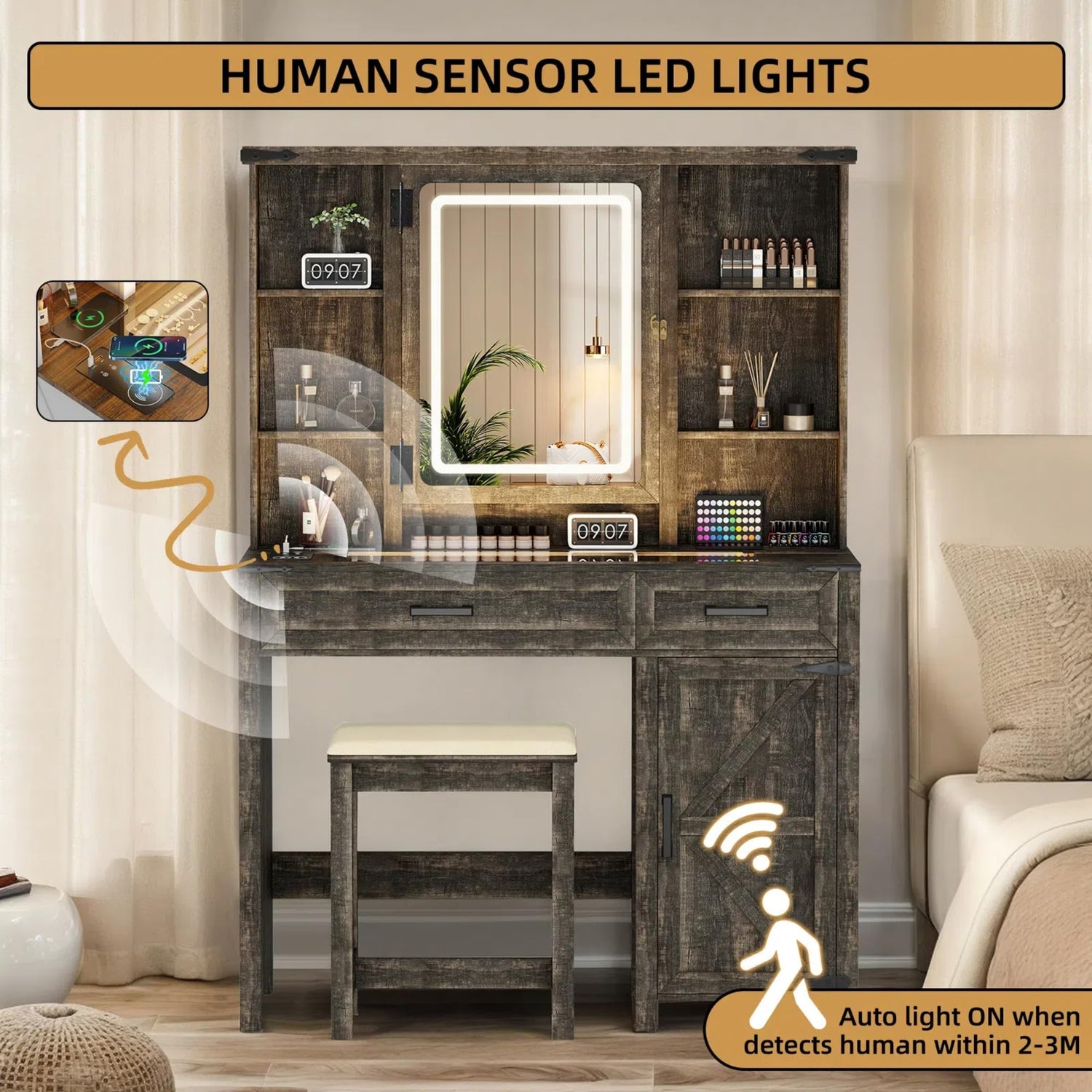 - Brightness Adjustable LED Lights: The vanity table includes a human sensor with 3-color LED lights, offering adjustable brightness from 0%-100% to suit various needs. The intelligent 360° sensor design ensures the light turns on automatically when it detects movement within approximately 1 meter
