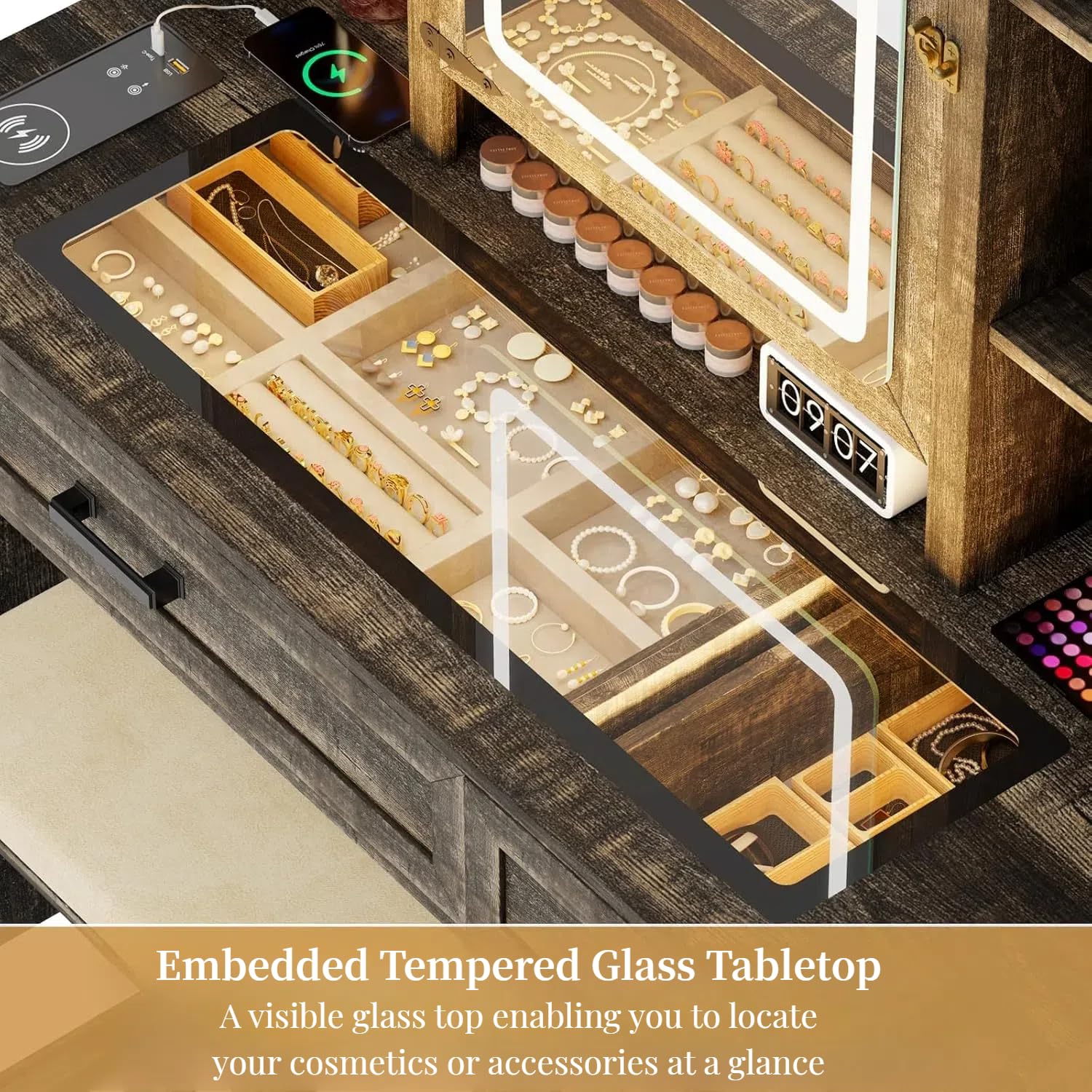 GlasFlength Farmhouse Makeup Vanity with Lighted Mirror,Vanity Desk with Charging Station,Vanity Table with Hidden Jewelry Cabinet,40'' Makeup Table with Glass Tabletop,Stool Included,Vintage Black