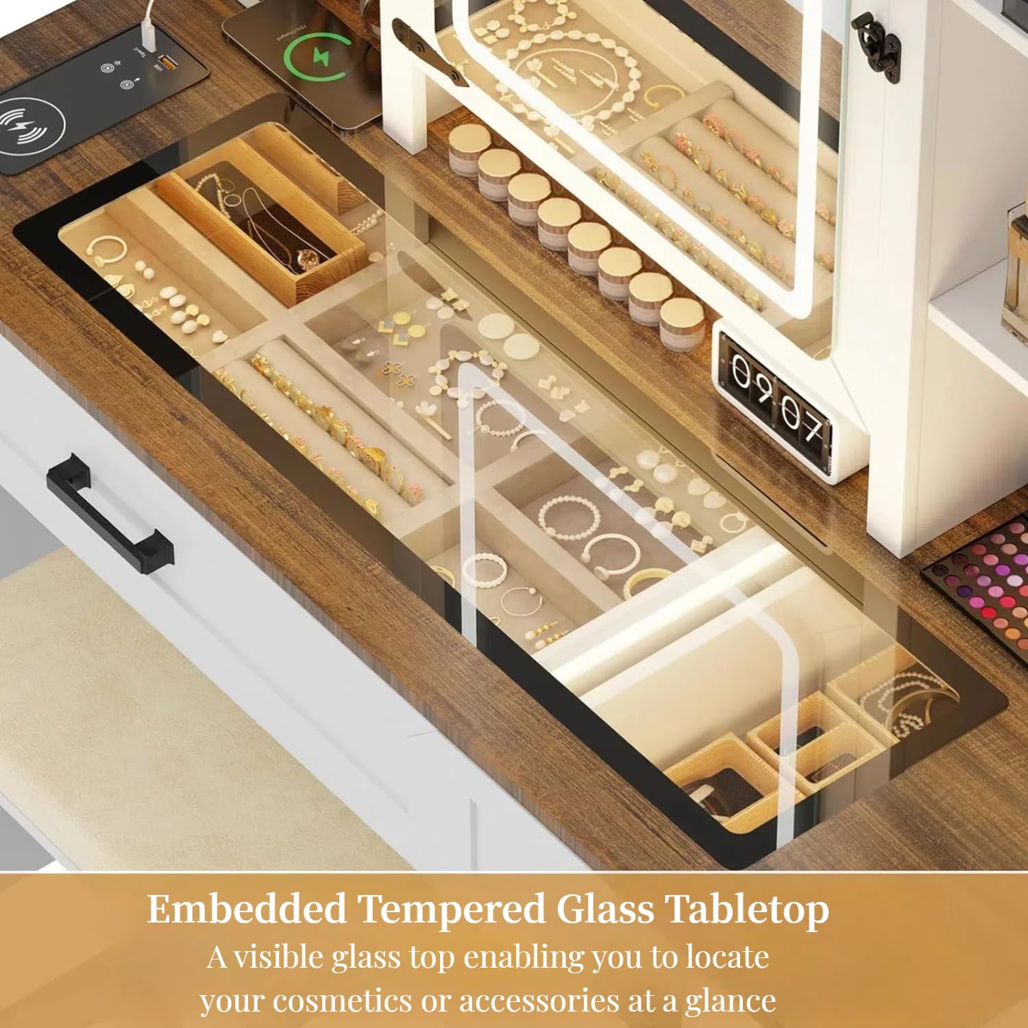 - Charging Station: The farmhouse-style makeup table is equipped with a 1x USB port, 1x Type-C port, and a wireless charging station, allowing you to easily charge your devices without searching for an outlet