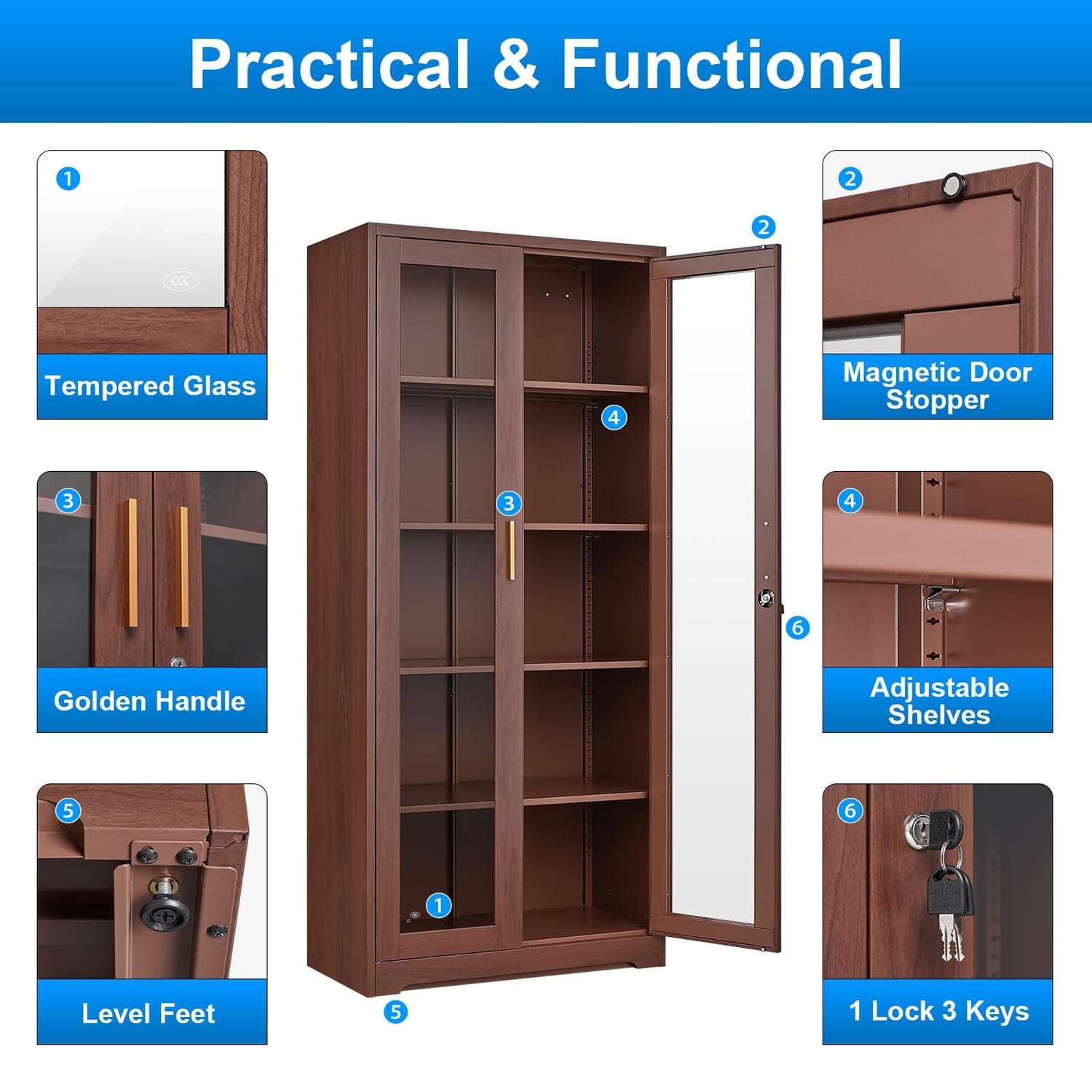 - Crafted & Safe Construction: This bookcase with glass doors and shelves comes with a safety lock to protect your belongings. Includes an anti-tilt mechanism that allows the display cases to be fixed to the wall, providing optimal stability and preventing any potential tipping accidents. In addition, adjustable shelves provide a versatile use of space, while doors have a magnetic function that easily closes automatically.