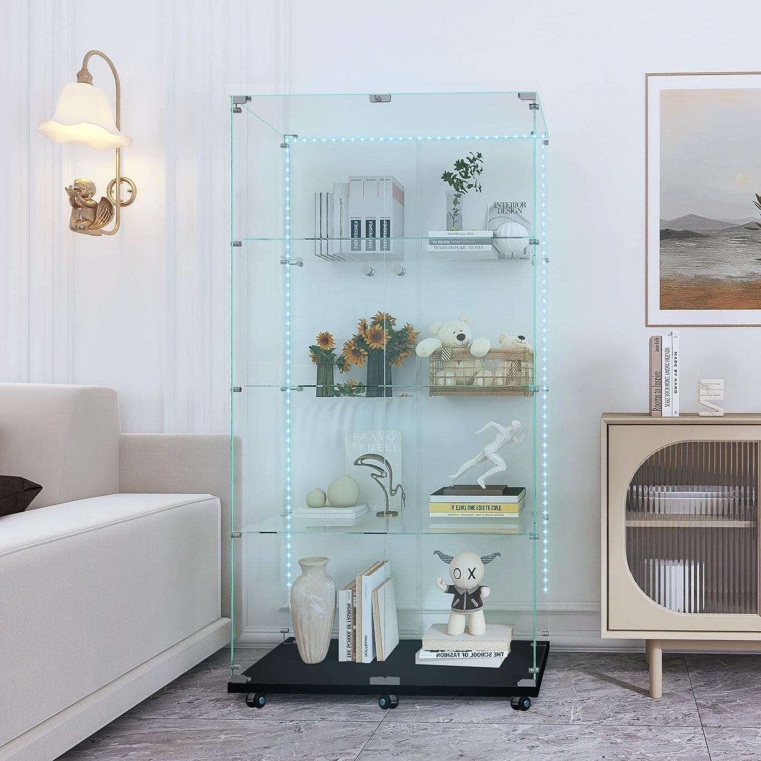 Glass Display Cabinet with 12 Color Lights and Lock 4-Tier 2-Door Curio Cabinets with Wheels Full Vision Showcase Tempered Glass Display Case for Living Room Bedroom Office, 65"*30.9"*13.6"Black
