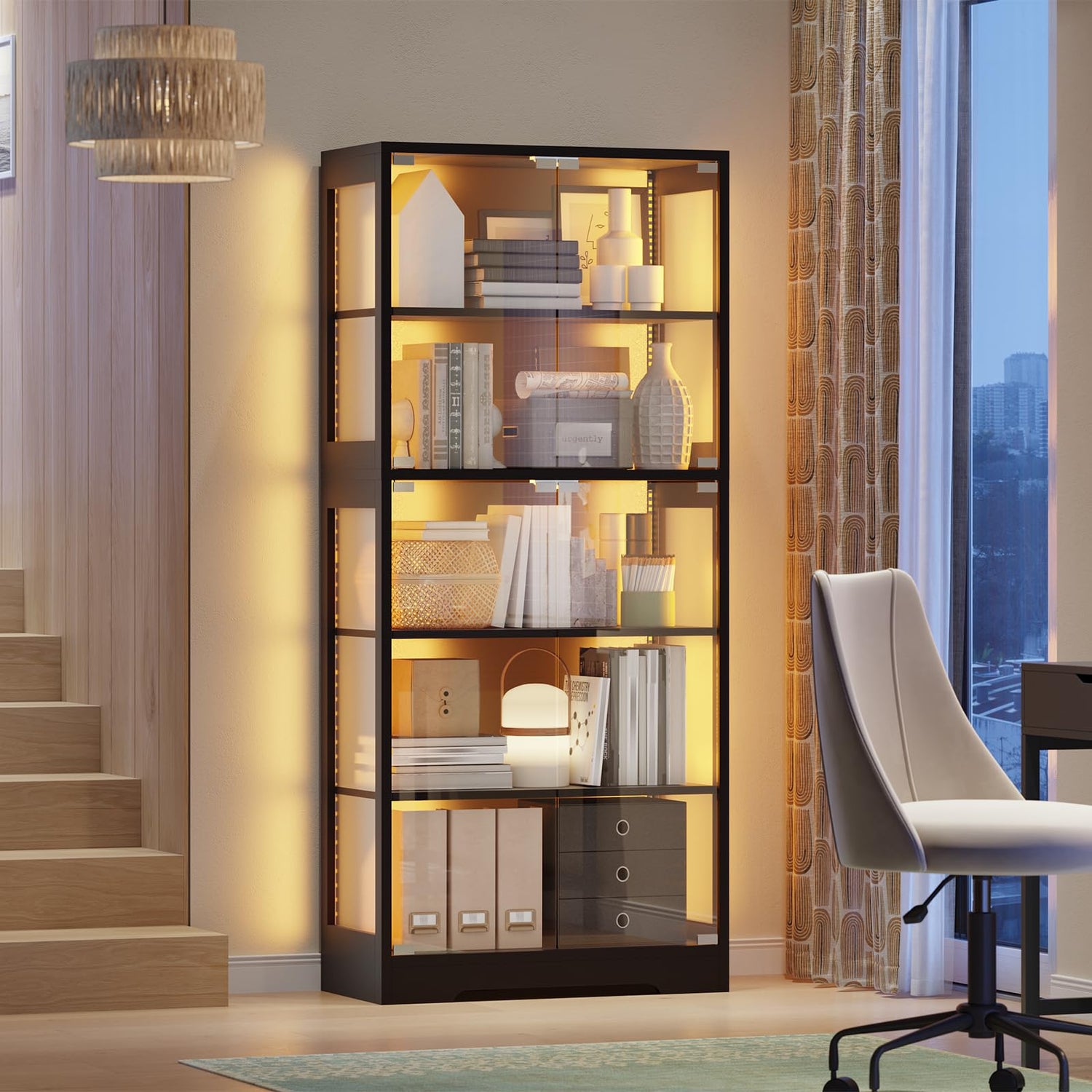 Details: Transform your living space with this modern glass display cabinet, a perfect blend of style and function. Featuring five open tiers, transparent tempered glass doors, and customizable RGB lighting, this piece not only provides reliable storage but also highlights your favorite items with elegance. Its multi-purpose design makes it suitable for living rooms, bedrooms, dining rooms, or offices—ideal for displaying collectibles, wine, books, or art pieces. Built from durable materials with a sleek finish, this cabinet is designed to last for years while keeping your home organized and stylish.