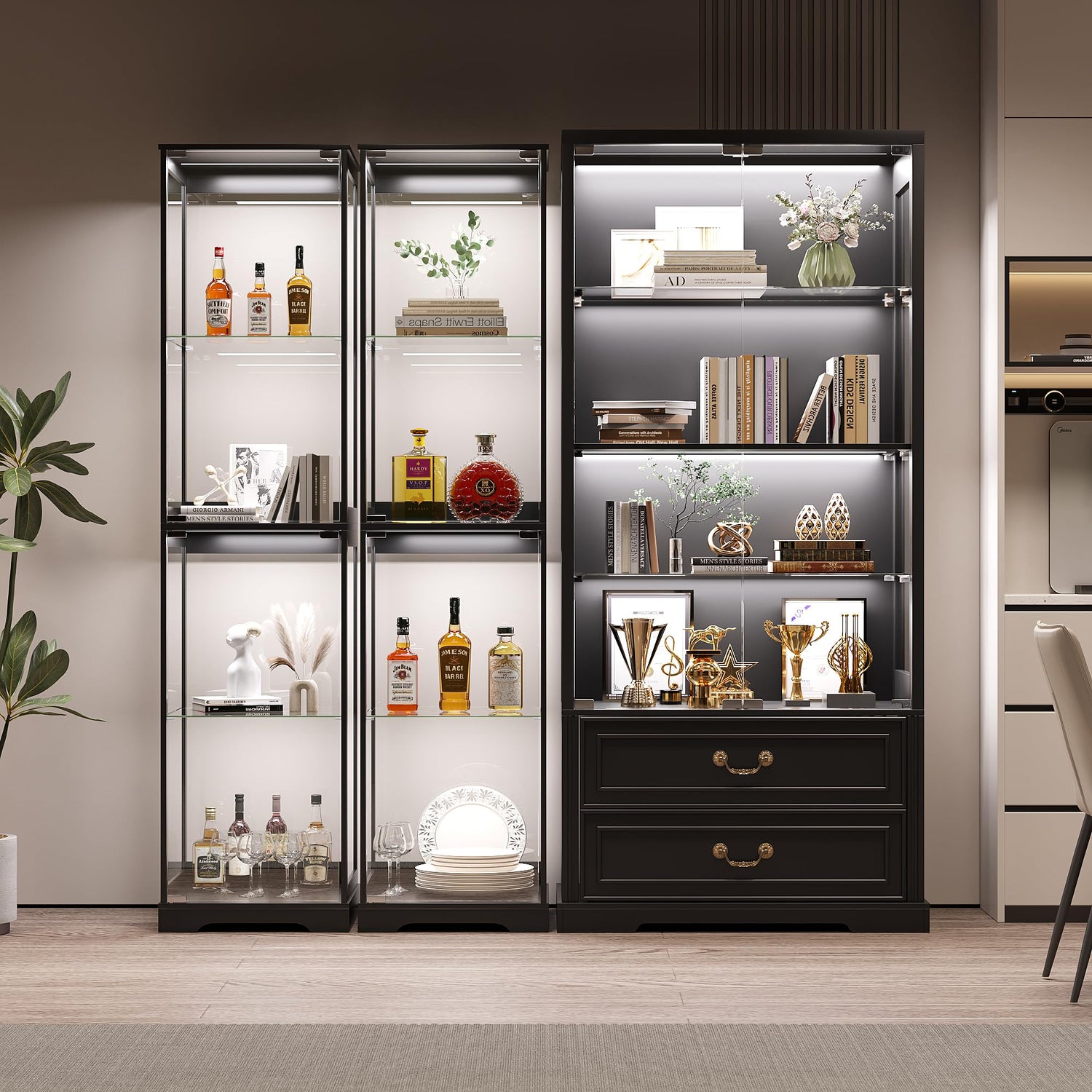 - 【Tri-color Light and Body Sensor】This display cabinet can freely switch between white light, yellow light, and blue light, and the brightness can be adjusted. Different light colors create different atmospheres to meet users' personalized needs. Motion-activated lights automatically turn on and off. When illuminated, they help prevent falls and collisions, enhancing safety. The lights automatically switch off, offering convenient operation while saving energy and reducing electricity consumption