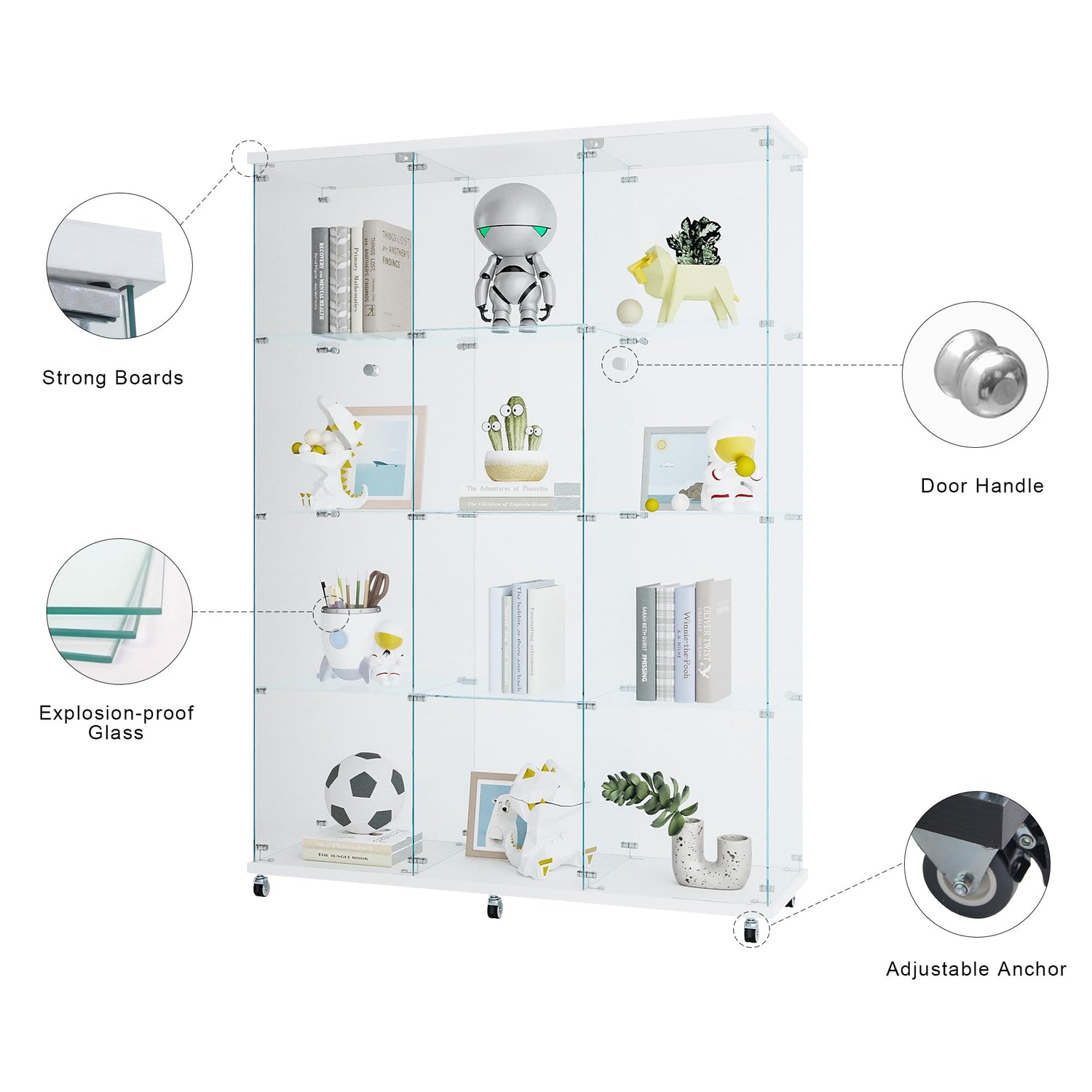 - Simple and Beautiful Design: Clear glass display shelves and doors provide an unobstructed view of your collection, giving you a clear view of your favorite antiques, books and toys while preventing dust and damage