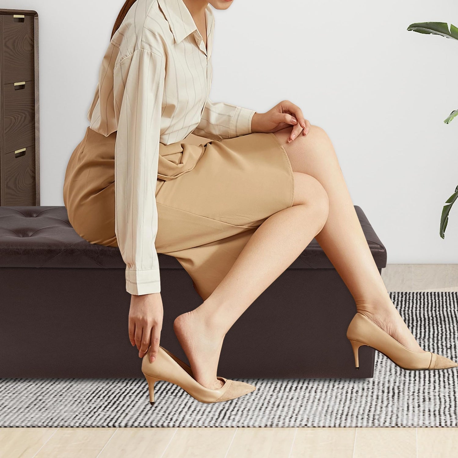 - FOLDABLE STORAGE BENCH: The collapsible storage ottoman size is 43"L x 15"W x 15"H. Max weight capacity is 600 LBS. Highly resilient foam padding ensures a comfortable sitting experience. The perfect space-saving storage makes your room tidier.