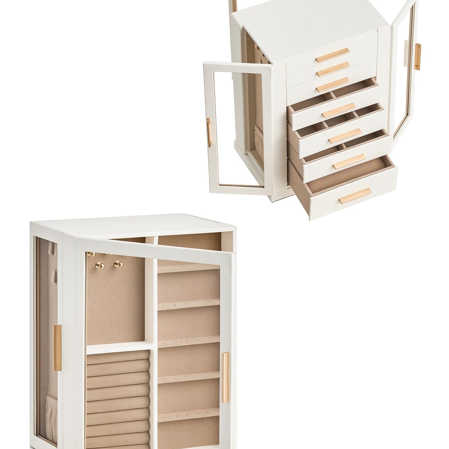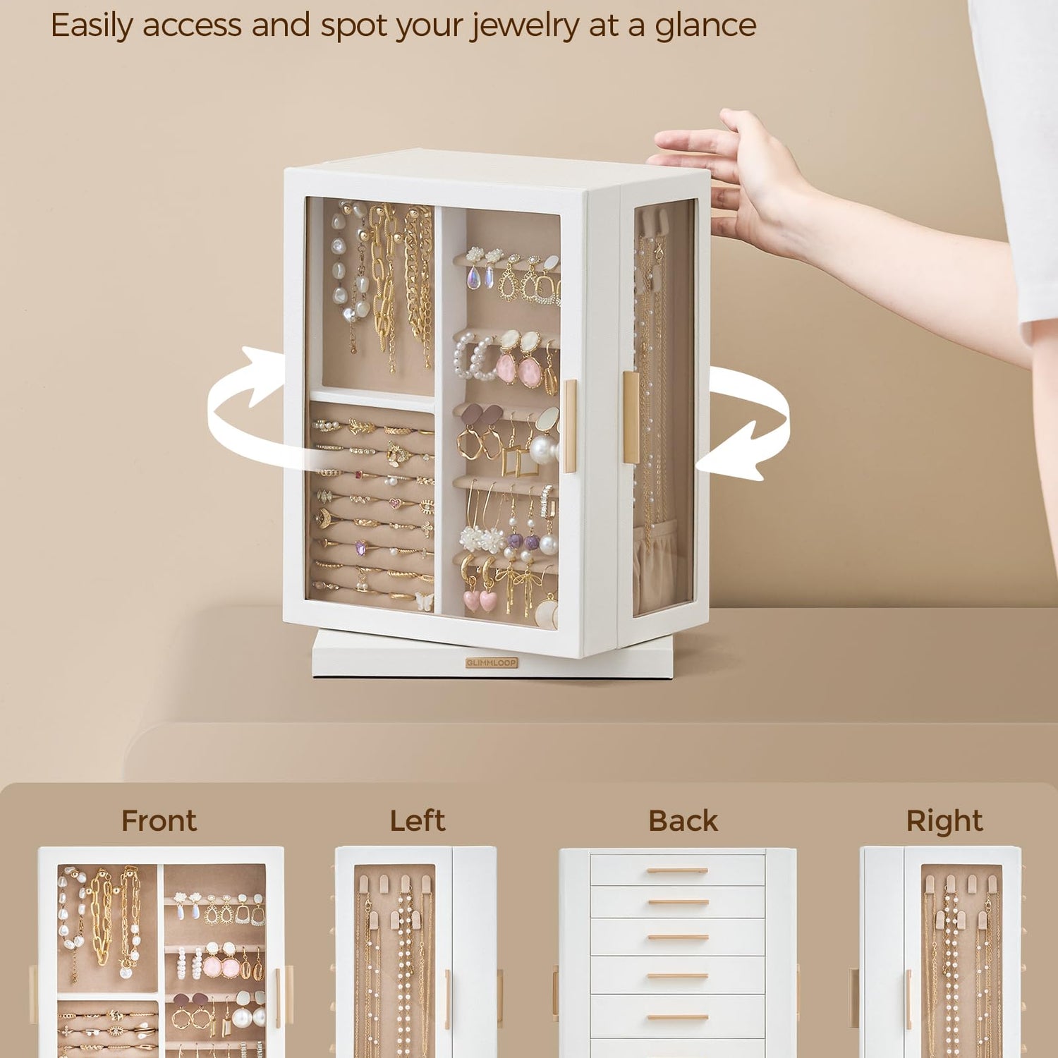 Glimmloop 360° Rotating Jewelry Box with 7 Drawers, Spacious Vertical Jewelry Organizer with Glass Window, Jewelry Storage Case, Dustproof & Moisture-resistant Design, White