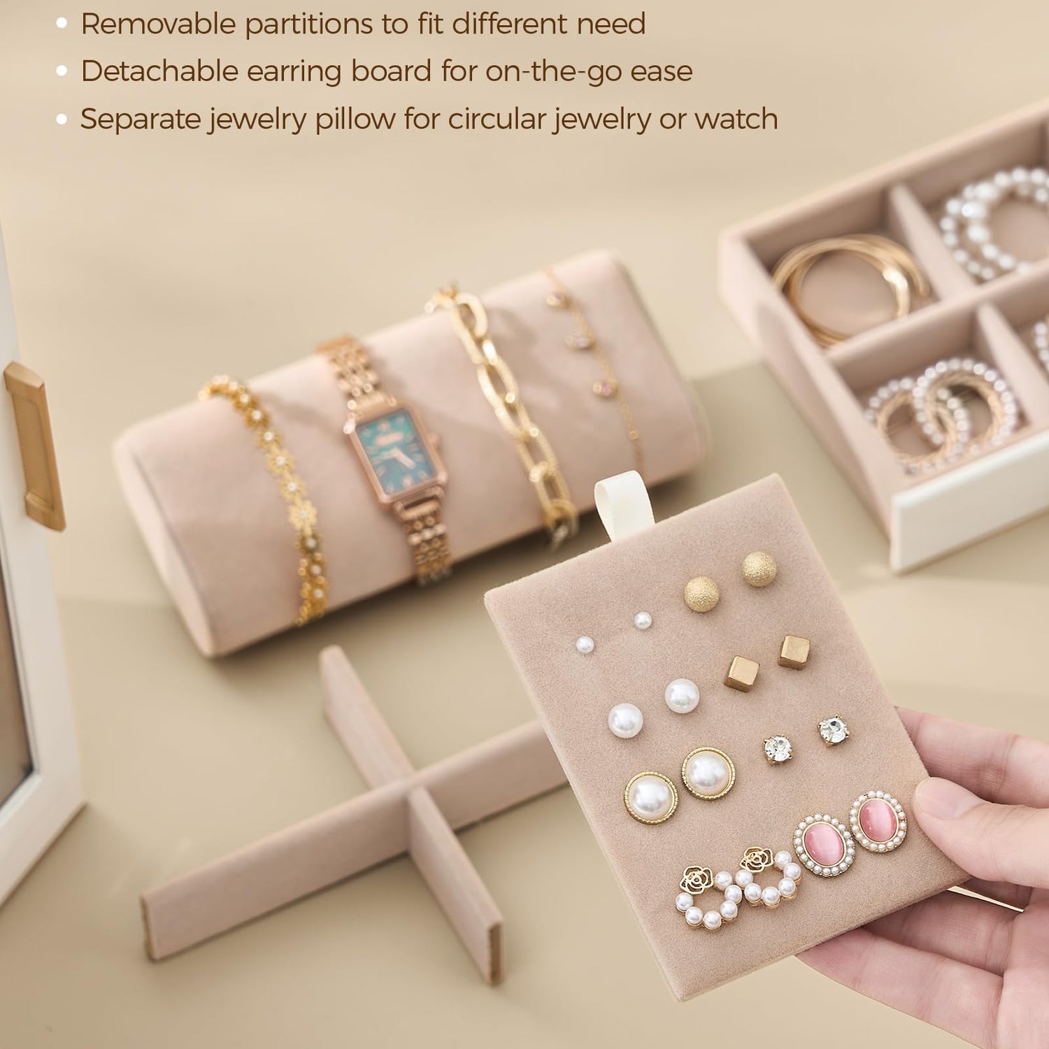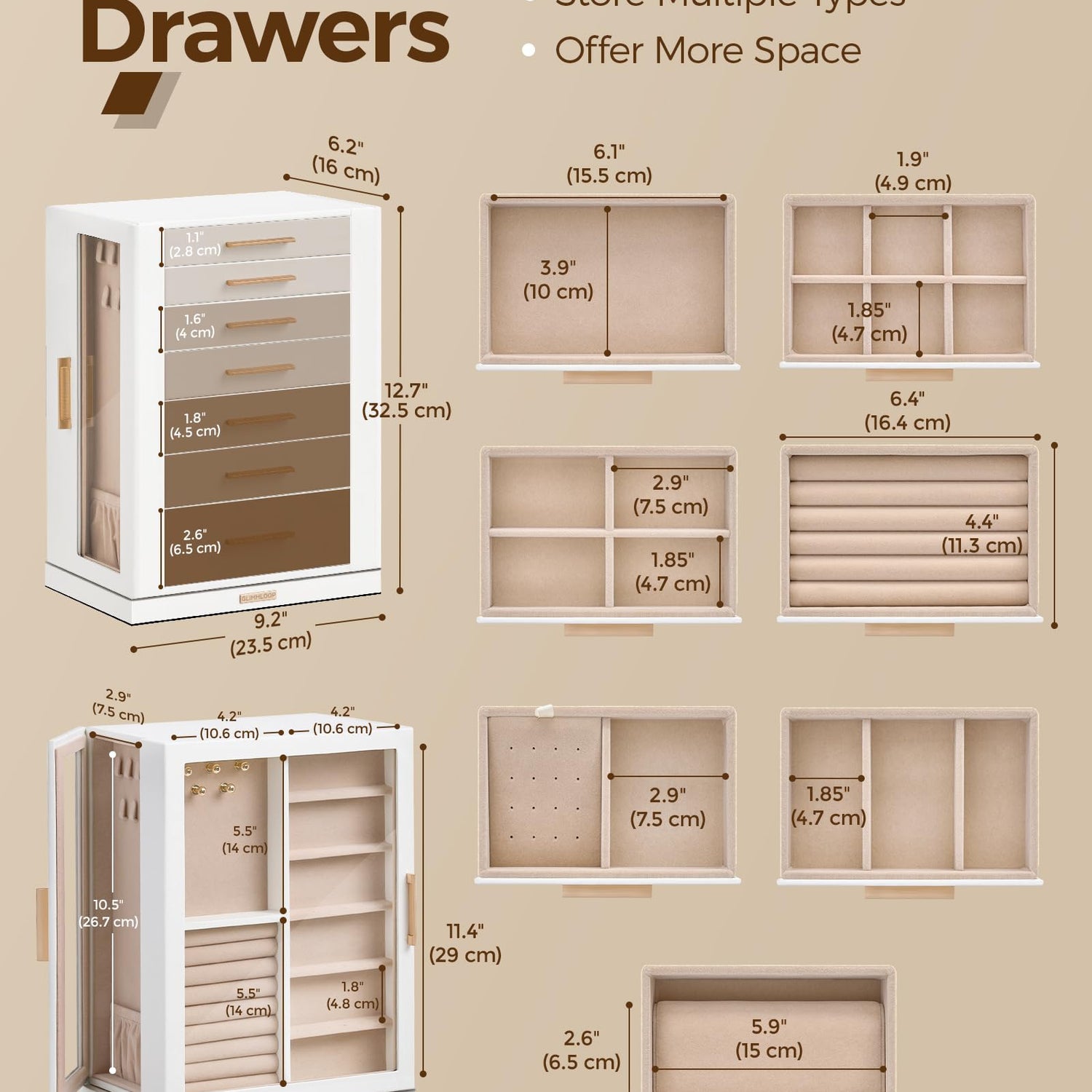 • 【Spacious Storage for All Jewelry Types】This jewelry box has everything you need for organized storage. It includes ring slots, earring holes, long necklace hooks, bracelet hooks, watch cushion, and 7 drawers–perfect for keeping earrings, rings, brooches, hair accessories, watches, and more neatly stored. Measuring 6.2"x9.2"x12.7".
