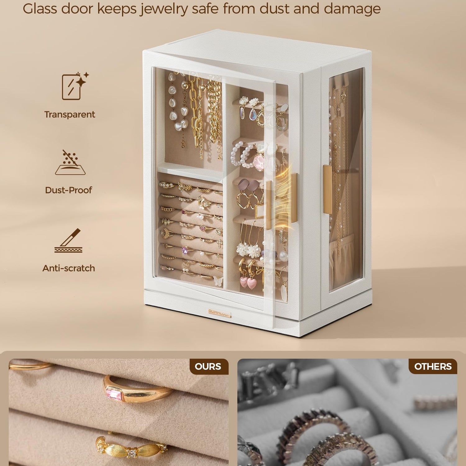 • 【Protect & Display】This jewelry box features three clear glass windows, a vertical layout, 360° rotation and a fully enclosed design. It's dustproof and moisture-resistant, keeping your jewelry safe while letting you easily display and find your pieces at a glance.