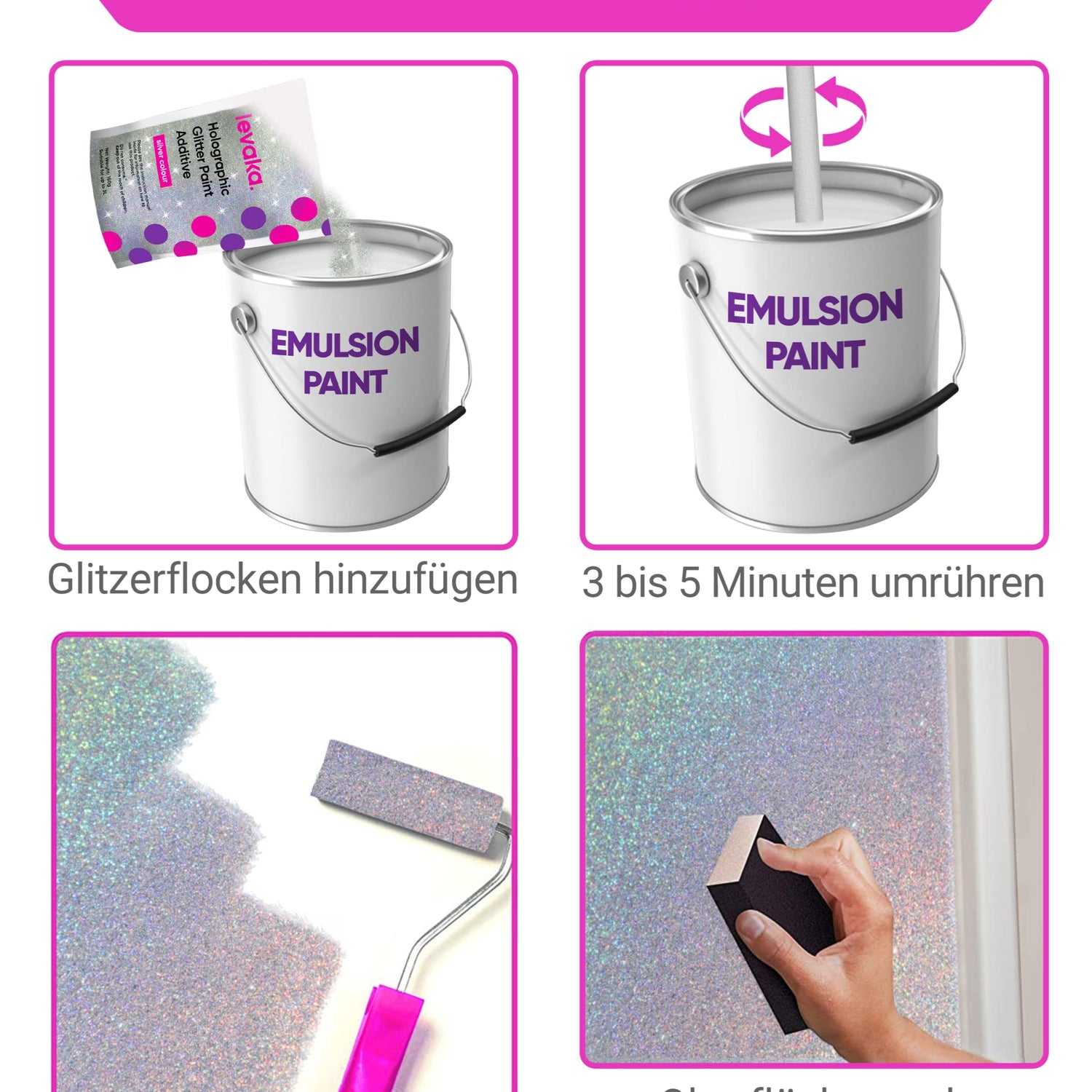 - Anyone can do it! – Your walls will be sparkling in no time! Simply open a pouch of the Levaka paint glitter additive for walls and add it to 0.5 gallons of paint. Stir for approximately 5 minutes and begin painting. Mix to your preferred ratio, but adding additional glitter will make your walls sparkle even more! It is strongly recommended to paint a small sample beforehand to see the effects for yourself and proceed accordingly. Ideal for Soft Sheen, Dead Flat, Matte, or Silk Emulsion Paint