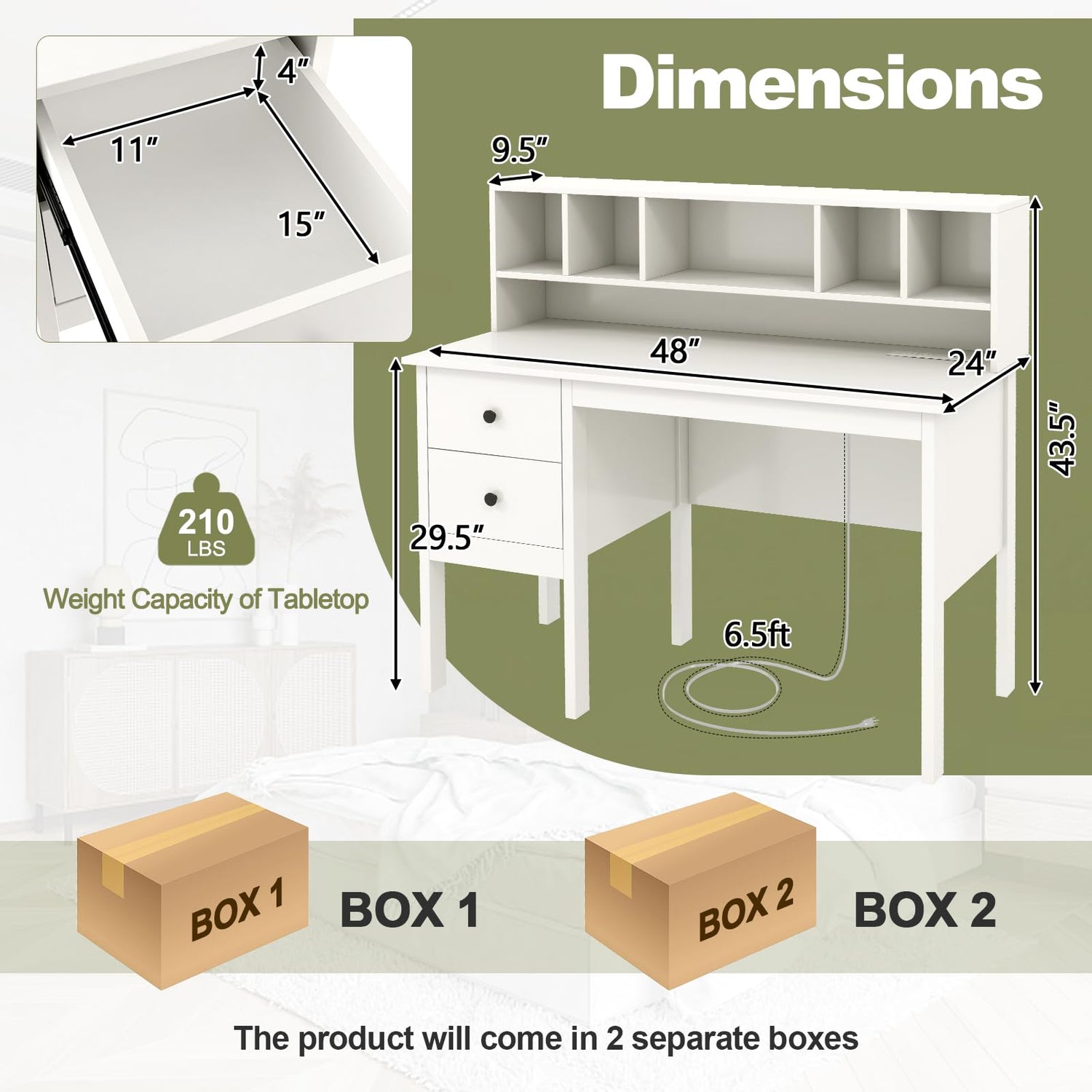 GLOBALWAY48” Computer Desk, Study Writing Desk with 5-Cube Hutch, 2 Drawers & Charging Station, Home Office Workstation for Living Room, Study & Bedroom, White