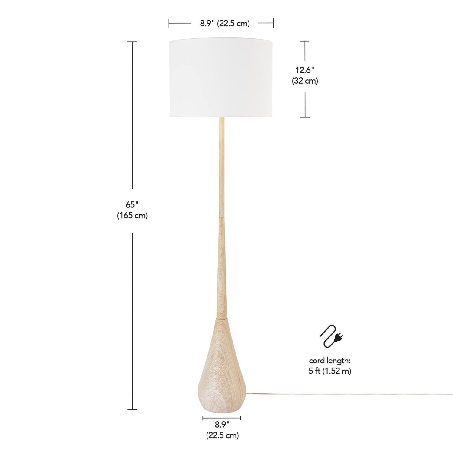 Details: The simplistic and rustic beauty of the Kanana 65" Faux Wood Floor Lamp embodies a stunningly modern and functional Japandi design. With a wood-inspired body and a classic white cotton shade, this large lamp would be an ideal addition to any living room seating area, bedroom lighting or home office design regardless of your pre-existing decor. Thanks to the convenient five-foot clear cord and on/off rotary switch located on the socket, you can effortlessly place the Kanana floor lamp anywhere you wish no matter where your outlets are situated. Making this a bright, stylish and functional piece perfect for any interior space!