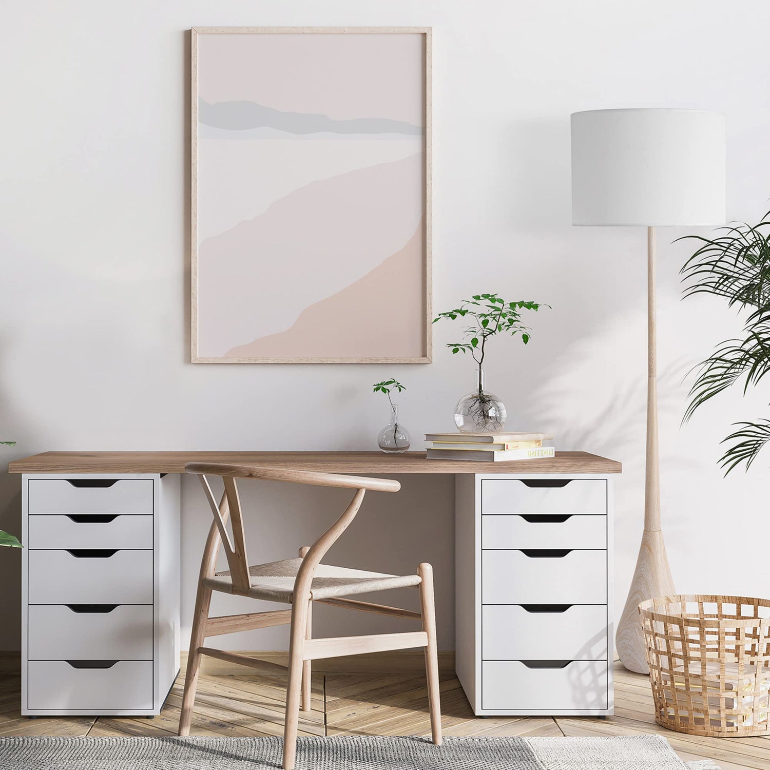 - JAPANDI: the nature-inspired faux wood base and classic white cotton shade of the Kanana 65" Floor Lamp embodies the Japandi styling of rustic and simplistic beauty