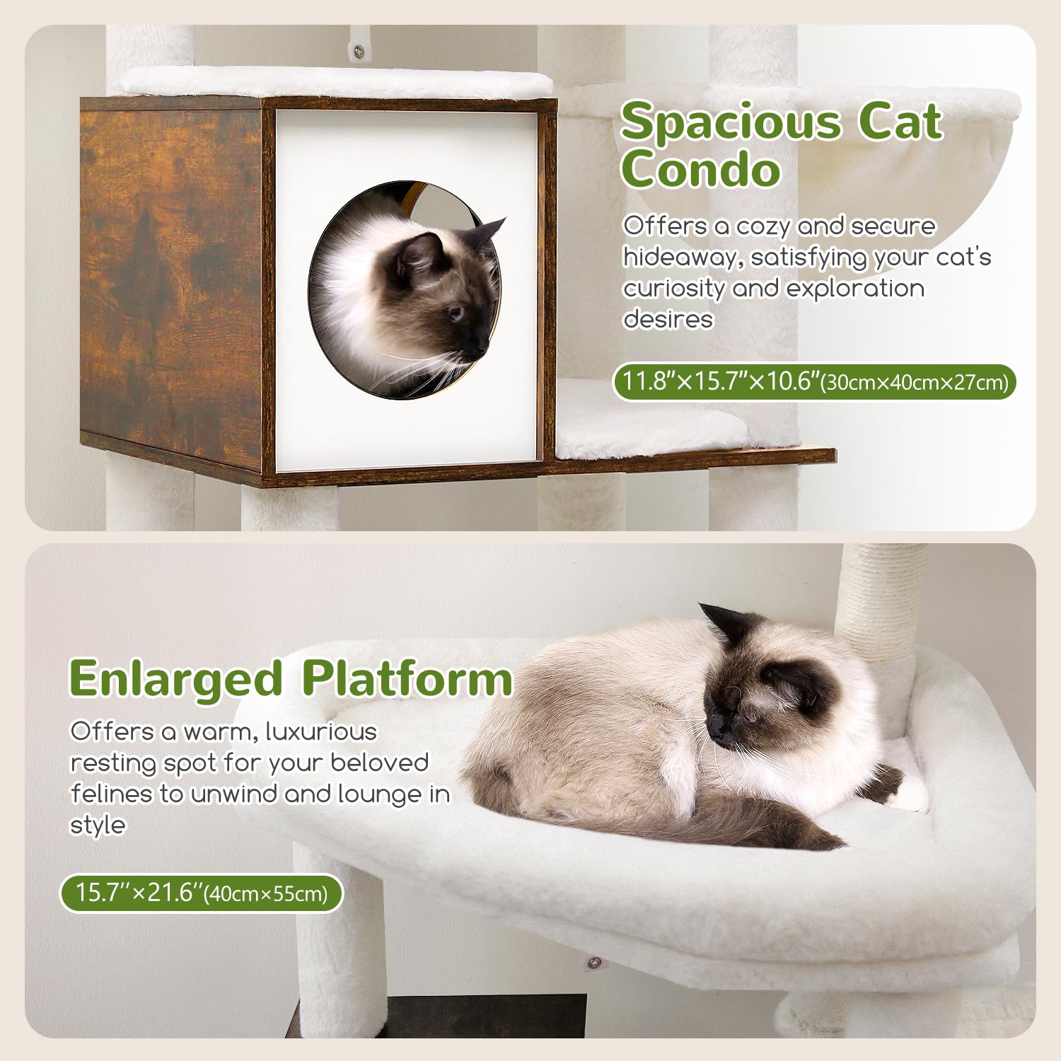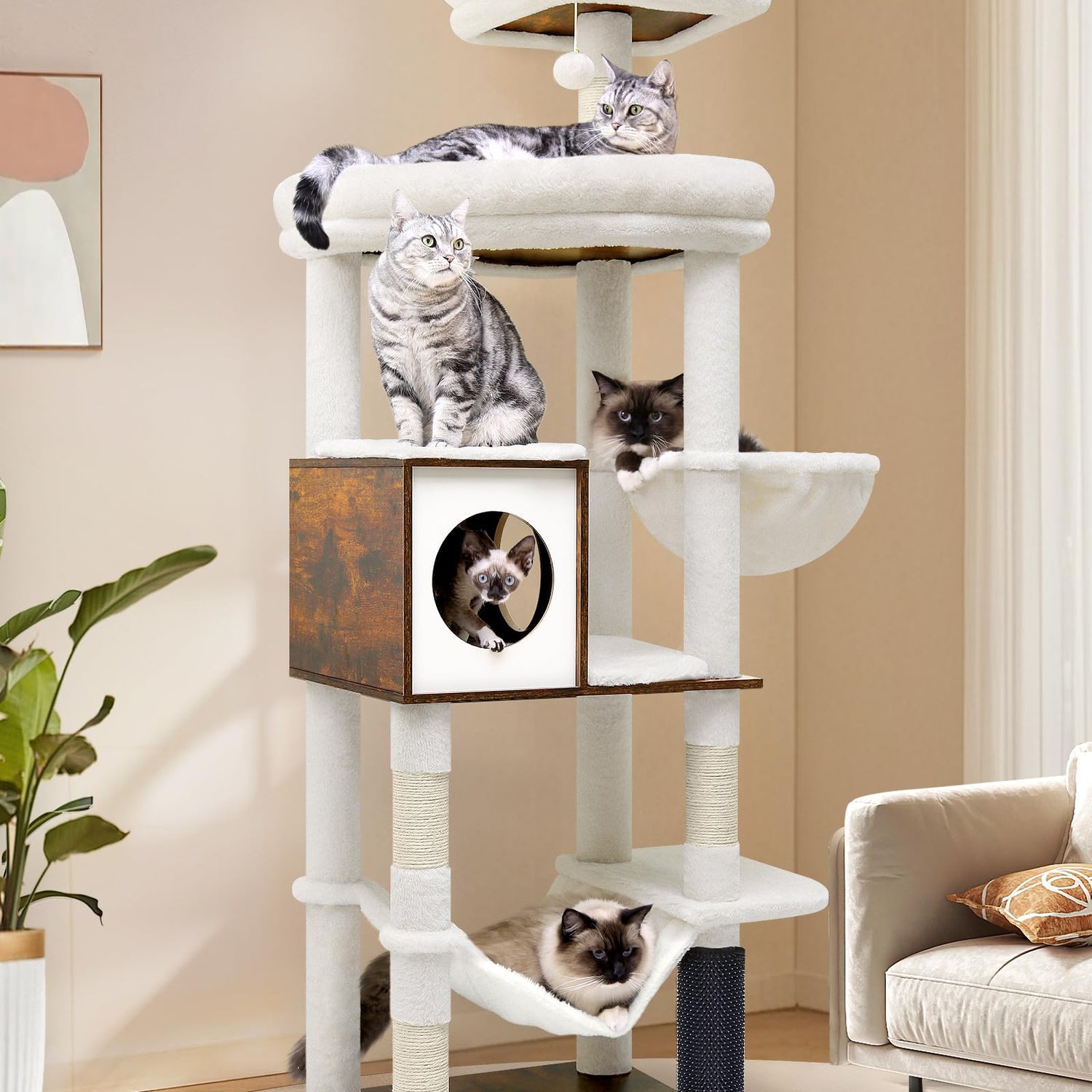 - Multi-Functional Design: Standing 66 inches tall, this cat furniture offers multiple levels for play, rest, and relaxation. Cats can play on the large platform, rest in the cozy cat condo, or relax in the hammock and hanging basket
