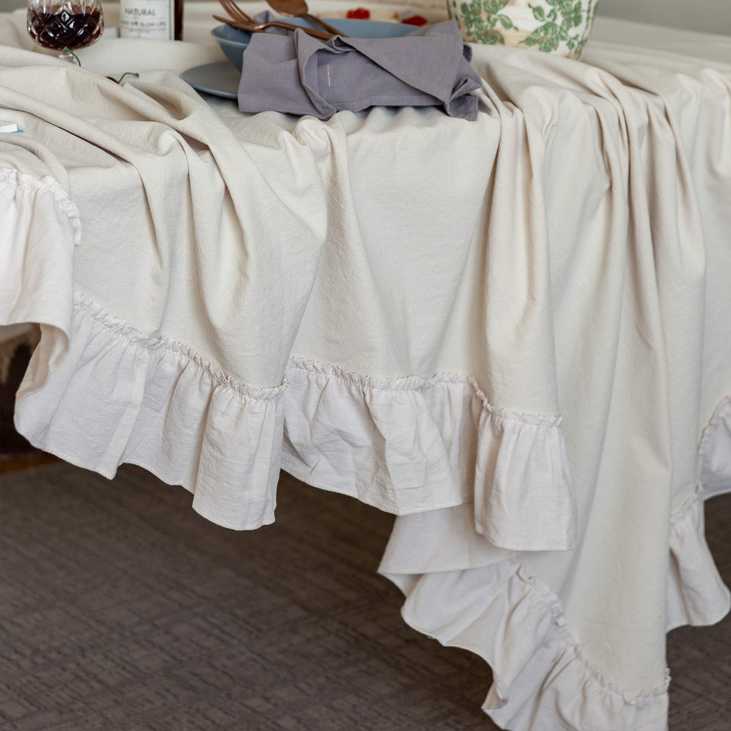 - [UNIQUE DESIGN] : Solid natural off-white color minimalist desktop with beautiful beige Flounces Trim,slight natural wrinkle on the washed cotton fabric,which make this table cloth vintage and elegant. This table cover will make your meal time more luxurious. suitable for outdoor, patio, gardens, kitchen room, dining room, family room and decoration