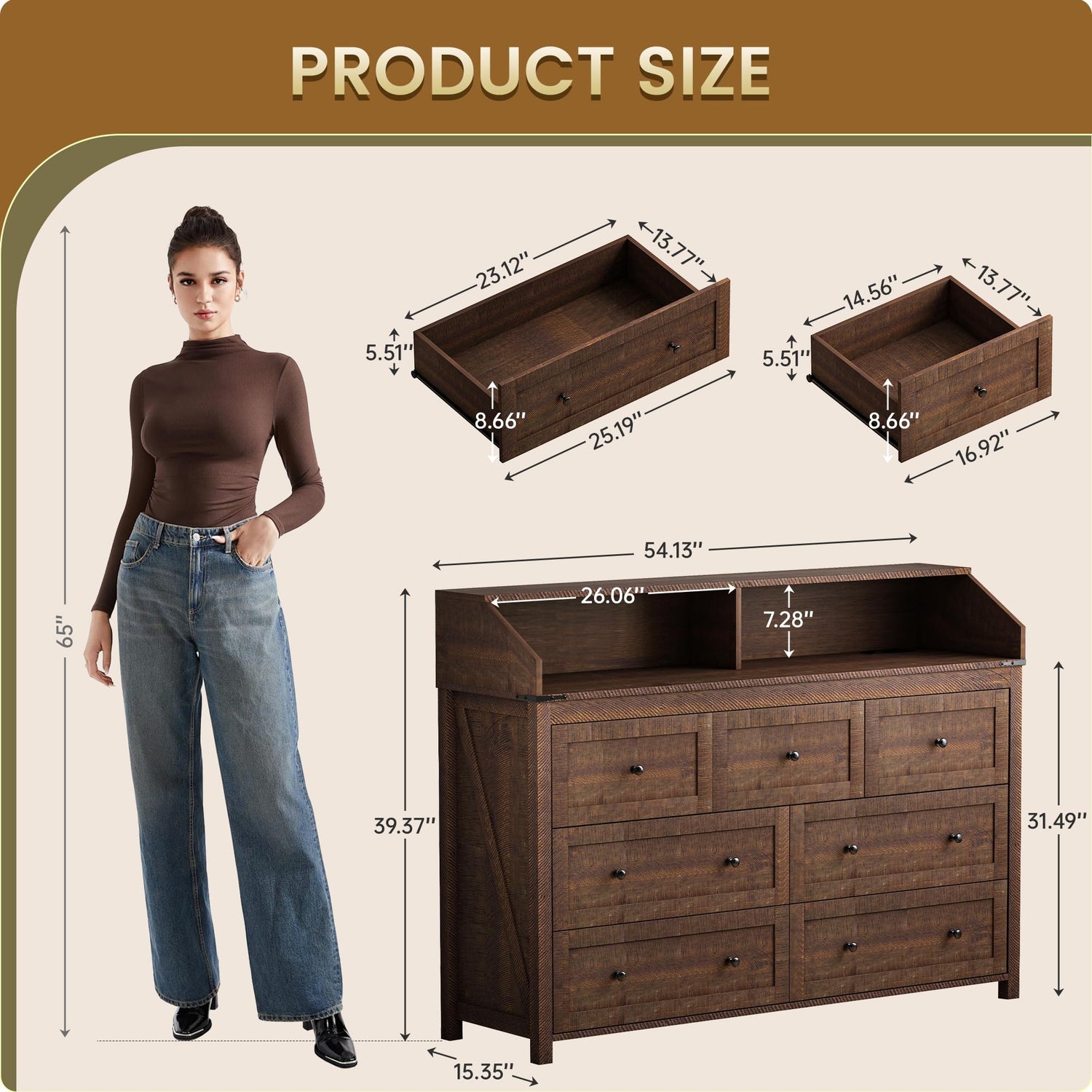 GlouMod Farmhouse 7-Drawer Dresser Chests for Bedroom, LED Dresser with Charging Station, Wood Rustic Tall Chest of Drawers, Brown