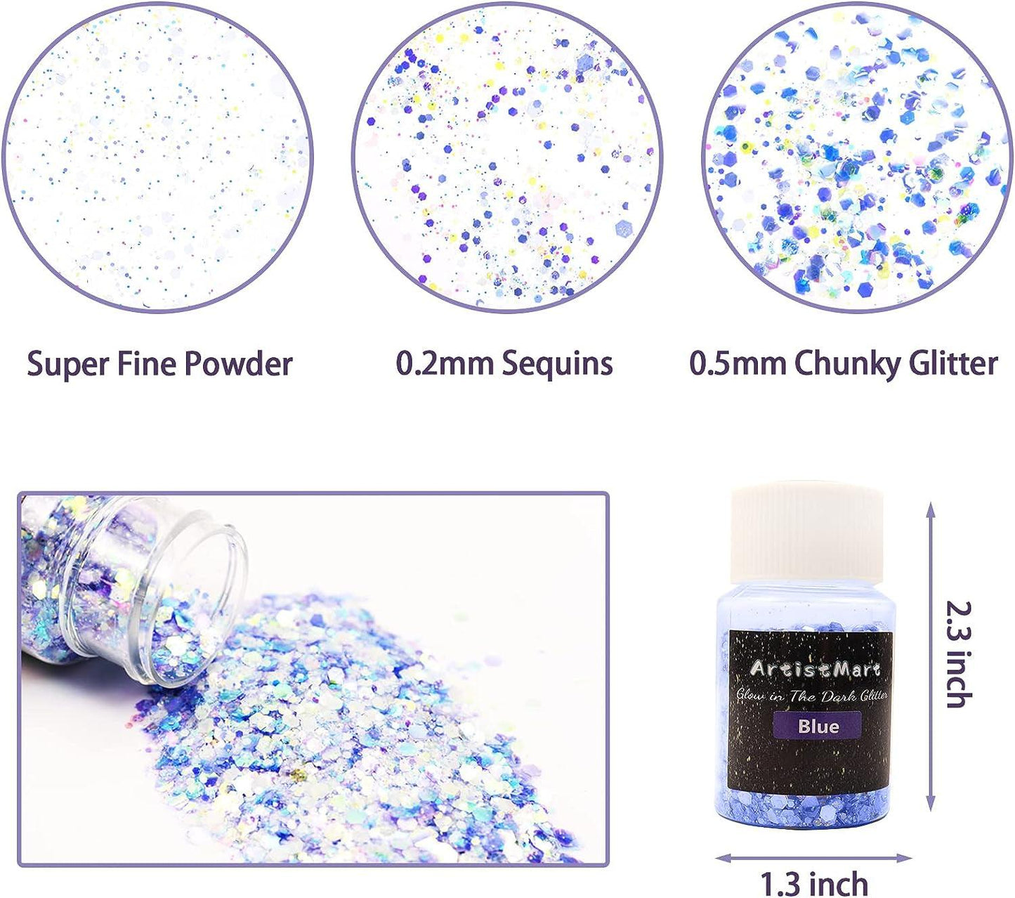 - 【Chunky Glitter for Crafts】This glowing in the dark glitter can be mixed well with epoxy resin, acrylic powder, glue, mica powder, great for DIY lovers, and can be widely used for slime, tumblers, greeting cards, phone cases, key chains, etc.