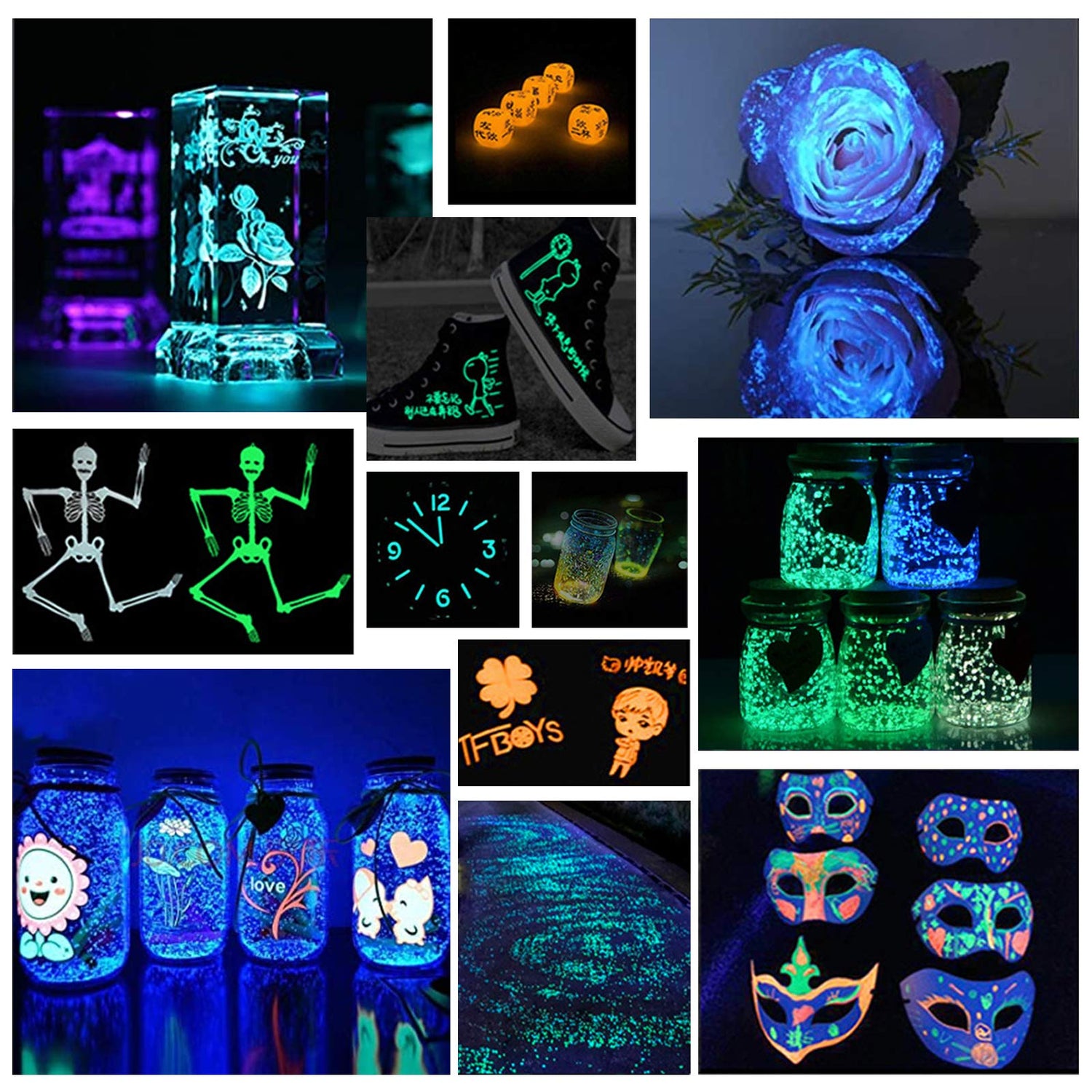 - Convenient to Use: Choose an appropriate amount and apply it to the desired place OR well mixed into other media (resin, paint, slime, etc.). The powder will glow after the uv light exposure. The greater amount of the powder and the longer time expose to the light, the brighter the powder.