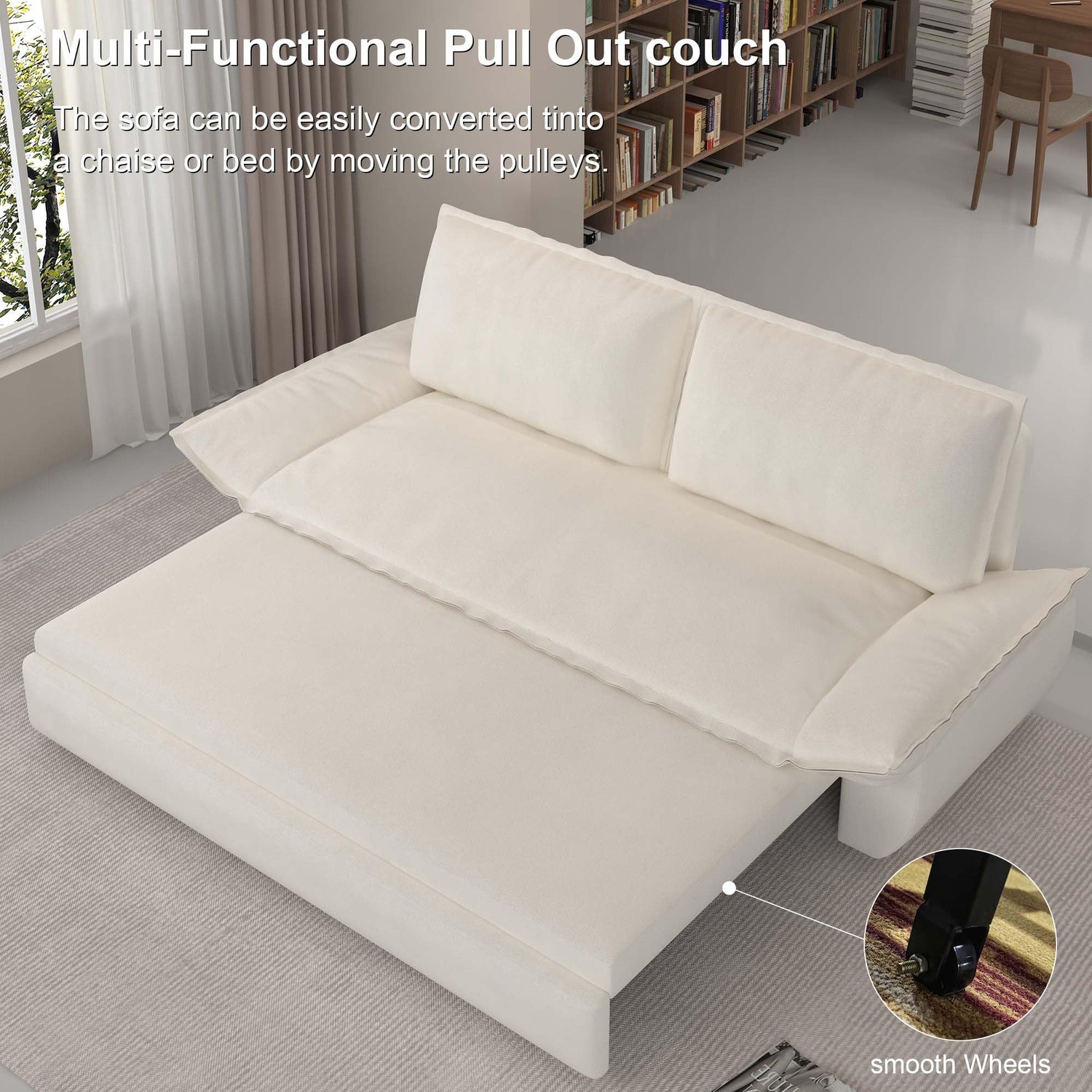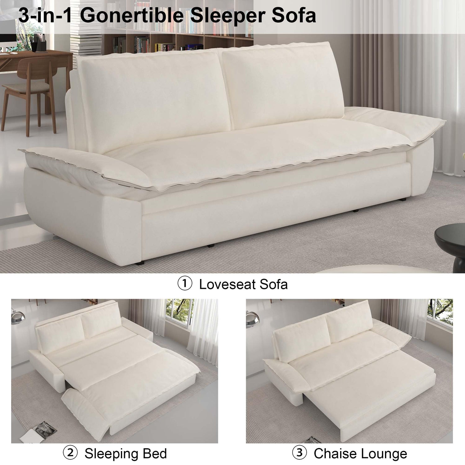 - 3-in-1 Convertible Sleeper Sofa Bed: The combination of sofa and bed provides more possibilities. Pull out the bed frame under the seat to quickly and easily convert the loveseat sofa into a chaise longue, queen size bed for relaxation and resting. There are two length options.