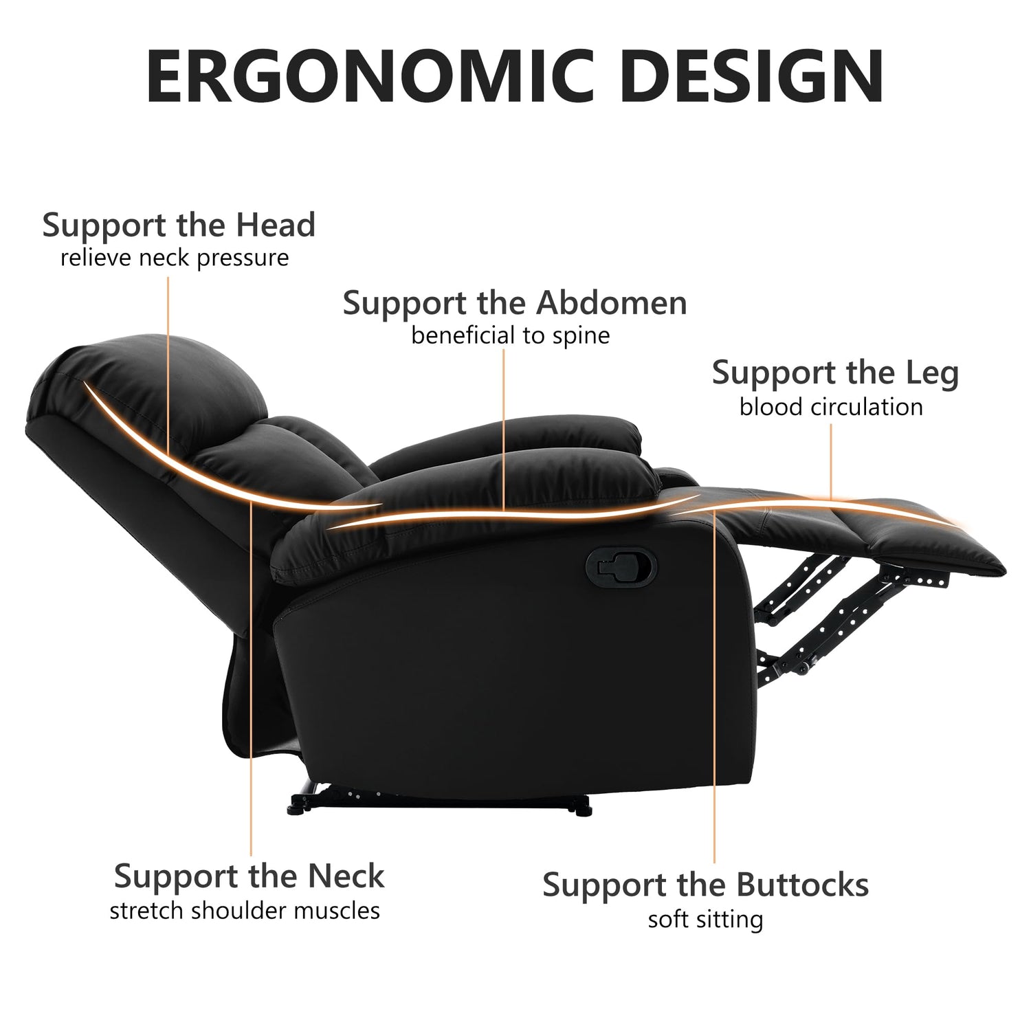 - High Quality Recliners: The black manual recliner chair for adults is made of New Technology Leather(Note: Not Tech Leather Fabric), which has the texture of leather, but softer and more breathable than other leather recliners. Waterproof and easy to clean, and the living room chairs‘s cushion is filled with high-resilience sponge, giving you a softer and more comfortable experience. This manual recliners for small spaces is the perfect Christmas gift for our family and friends!