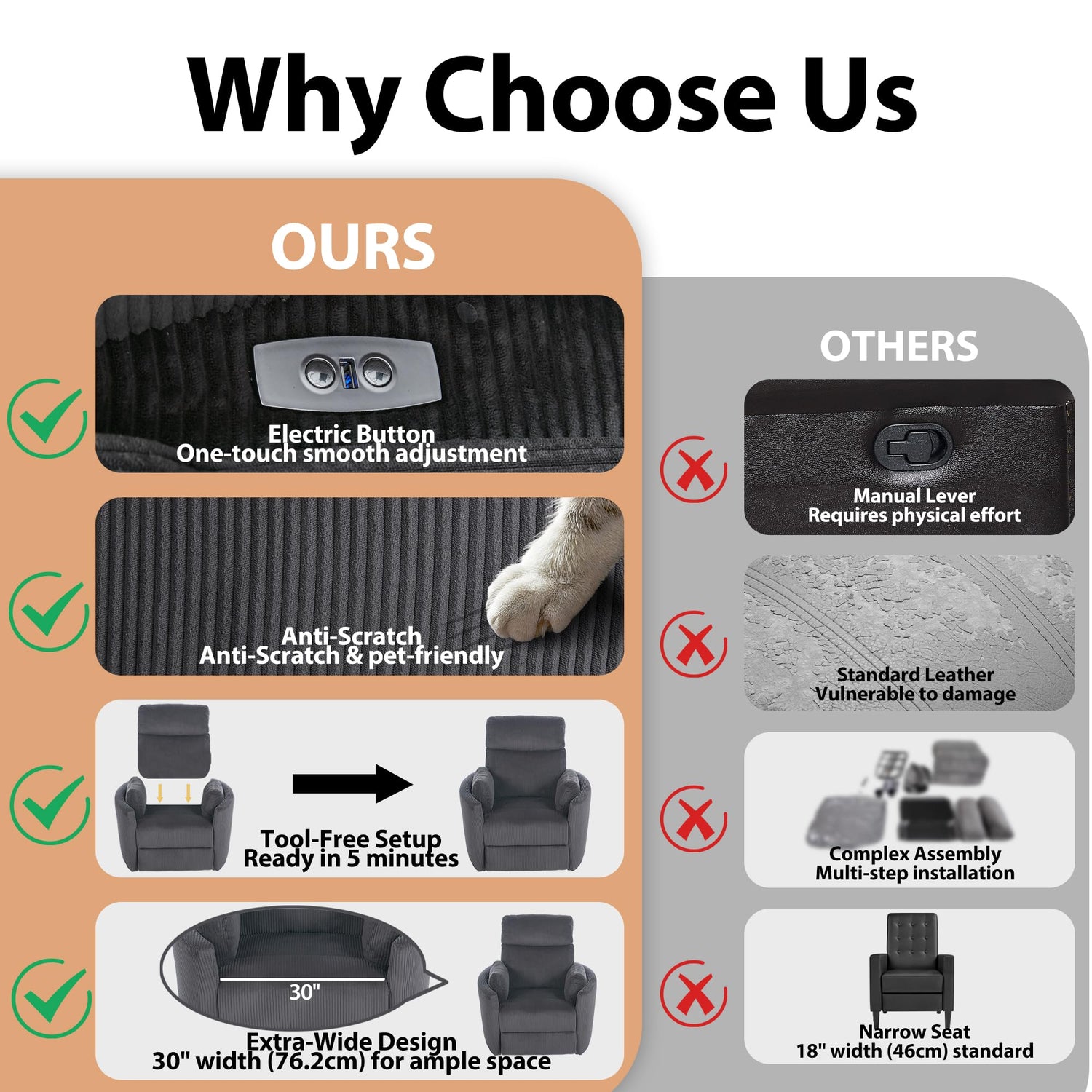 - 【Plush Corduroy Comfort & Smart Charging:Rocking Recliner Chairs for Adults】 Sink into cloud-like softness with premium ribbed corduroy – naturally anti-scratch and gentle on sensitive skin. Built-in lumbar support cradles your posture while USB ports keep devices powered. Ideal for nursing sessions in rocking chairs or remote work in small spaces