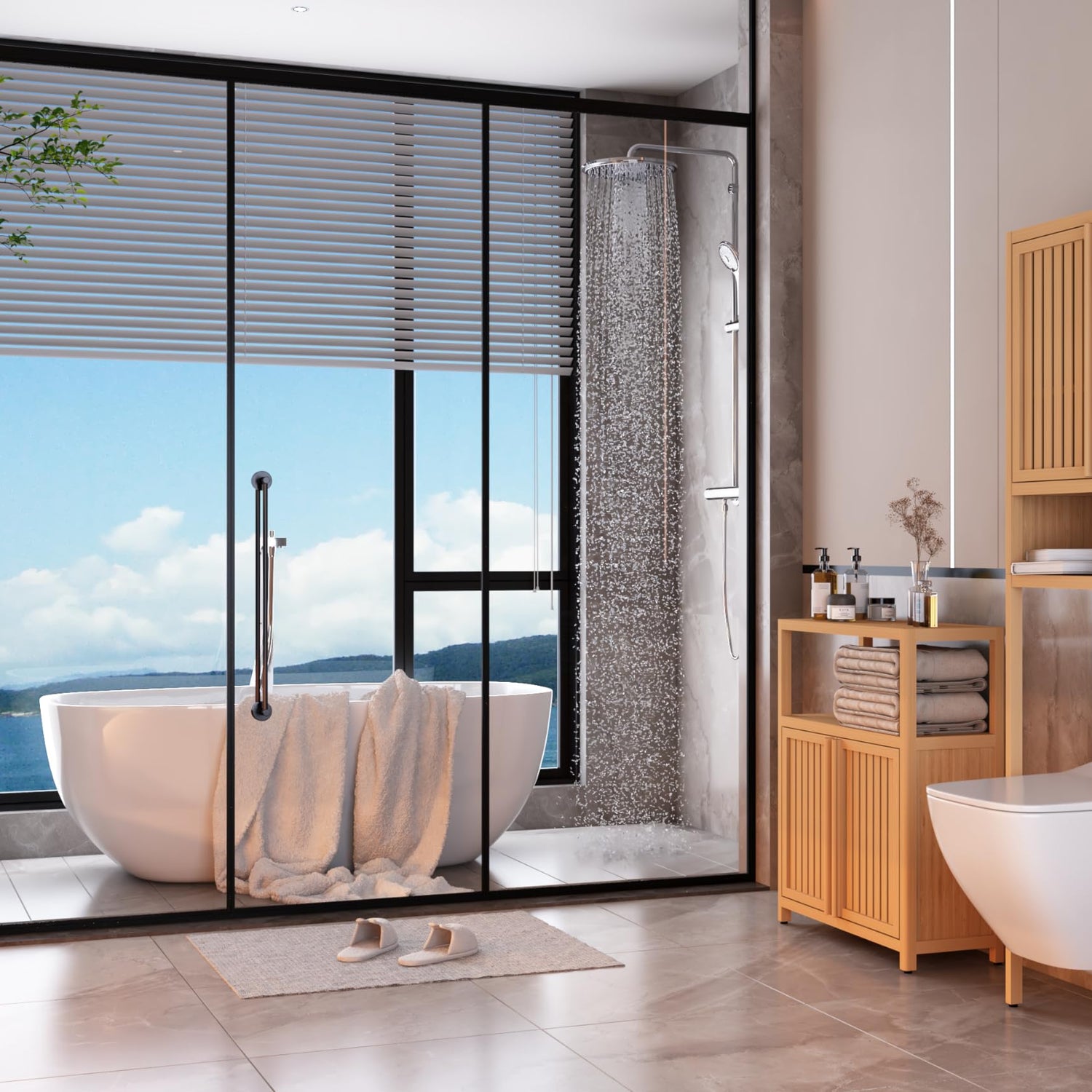 Details: The Bathroom Storage Cabinet , a versatile and functional piece designed to keep your space neat and organized. This freestanding cabinet features a wide top, open shelf, and a main cabinet with double slatted doors, offering ample storage for a variety of daily essentials like towels, toiletries, decorations, and more. The adjustable bamboo shelf inside the cabinet allows you to customize the storage space according to your needs, making it a practical solution for any room.
