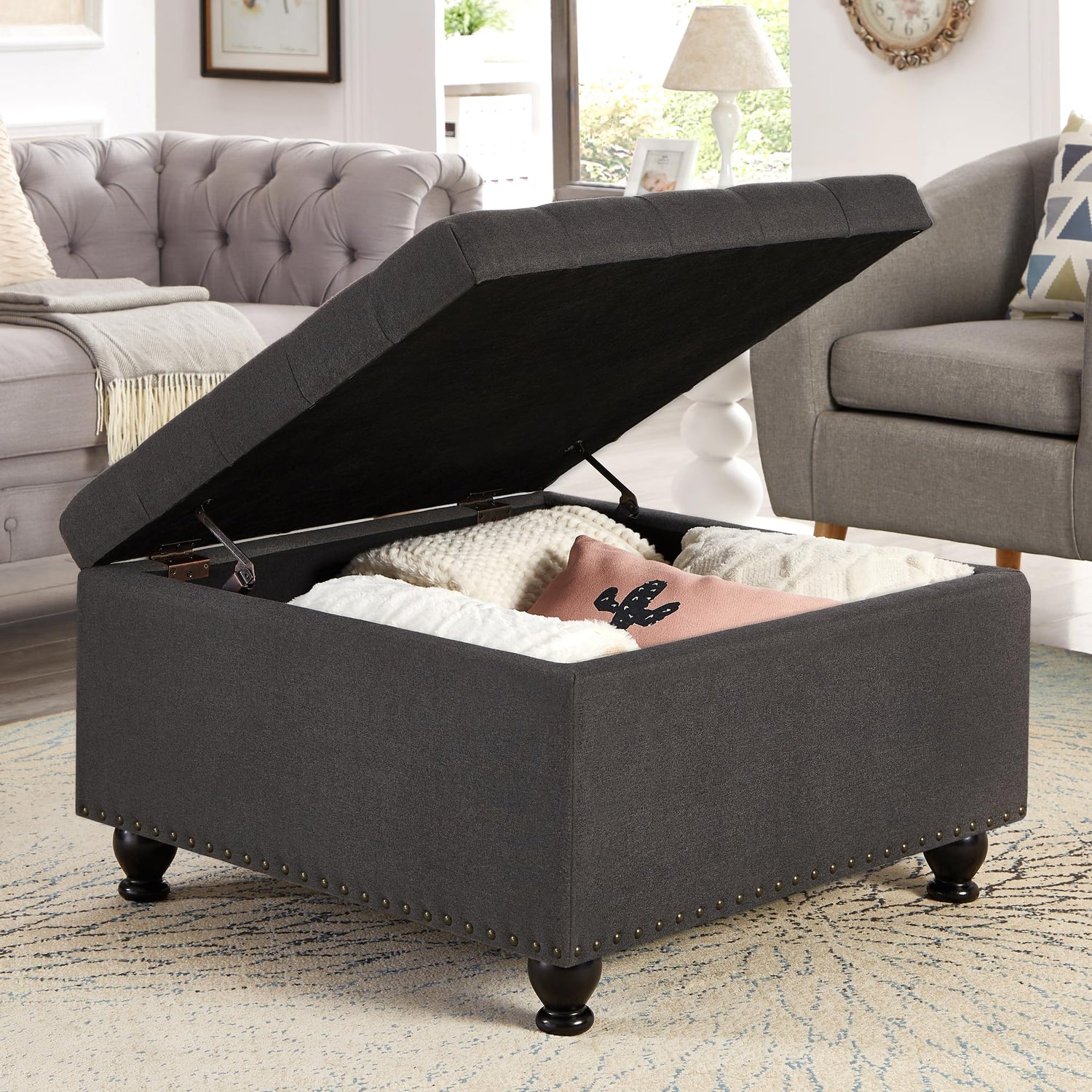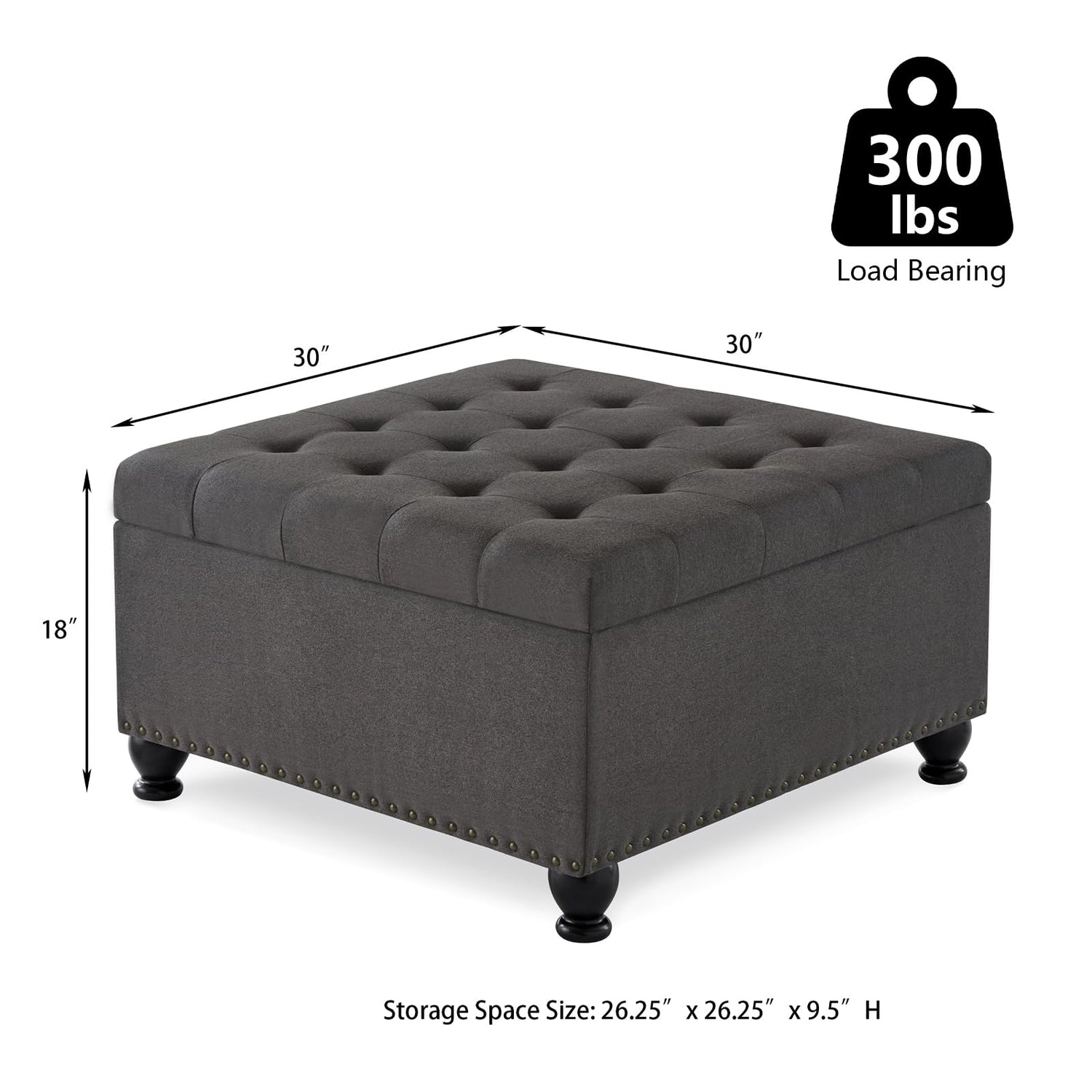 GOAWGO Large Square Storage Ottoman Upholstered Button Tufted Coffee Table with Rubber Wood Legs, Linen Fabric Foot Stool Oversized Ottoman Foot Rest for Sofa Couch Living Room Bedroom, Dark Grey