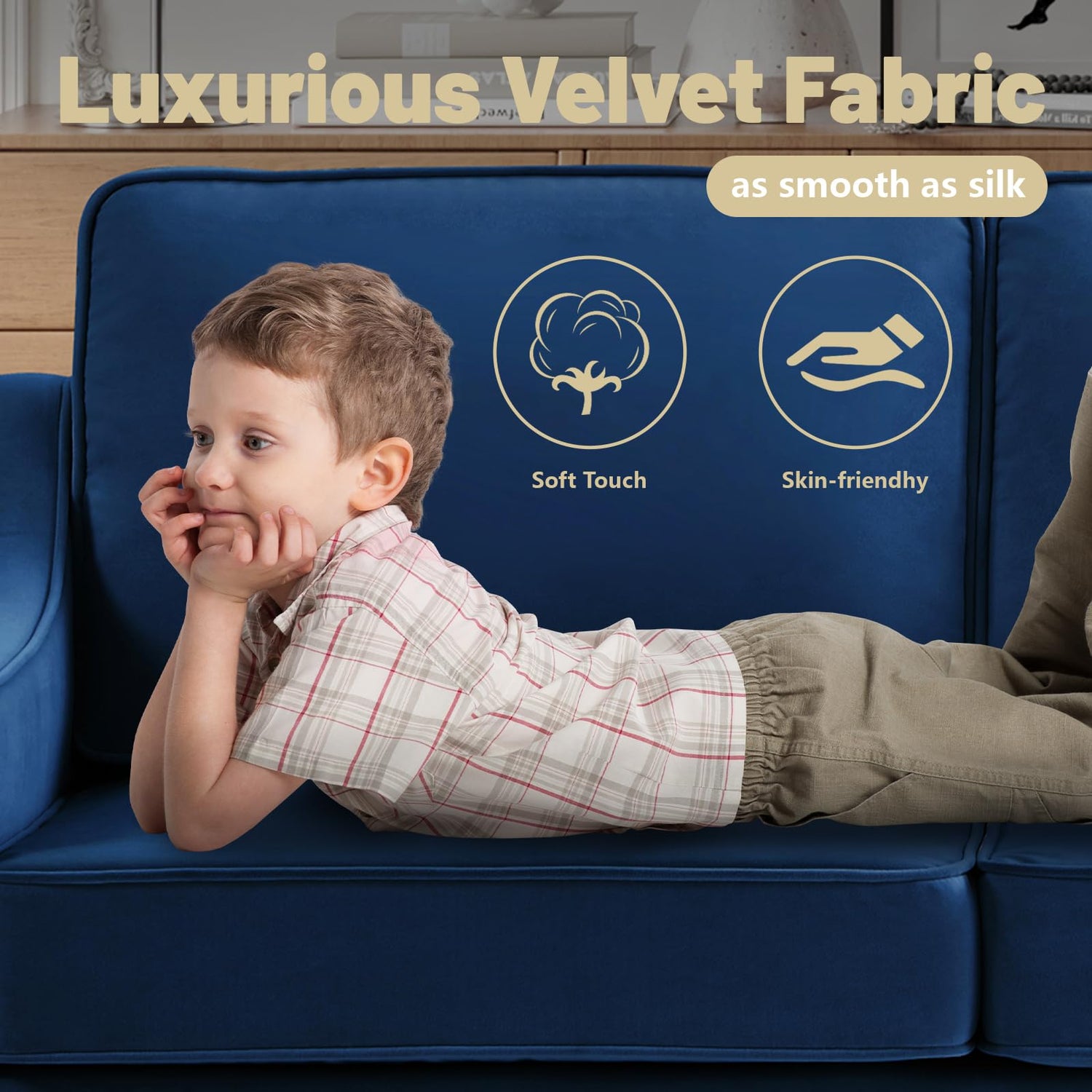 - Skin-friendly Velvet Fabric: Wrapped in luxurious velvet fabric , this velvet couch provides a smooth and skin-friendly touch. Resistant to color loss and pilling, the fabric ensures long-lasting beauty and comfort.