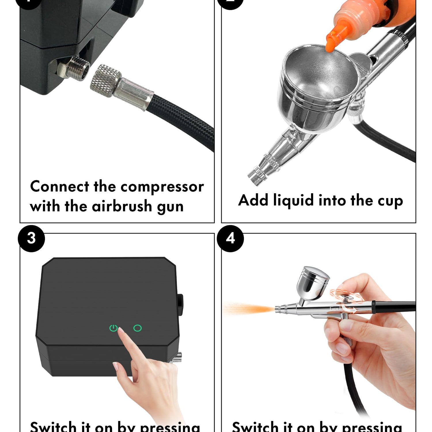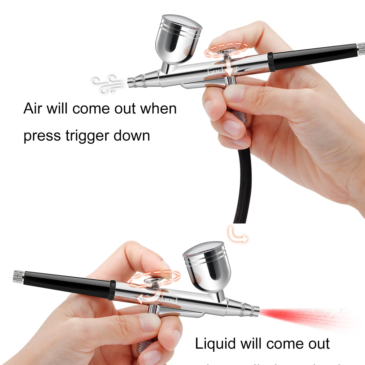 - Dual-action design: The airbrush compressor with double-action airbrush, enabling fluid control through the end part of the airbrush gun and regulation of pigment volume and air via the trigger on the airbrush pen, avoid of waste on painting ink