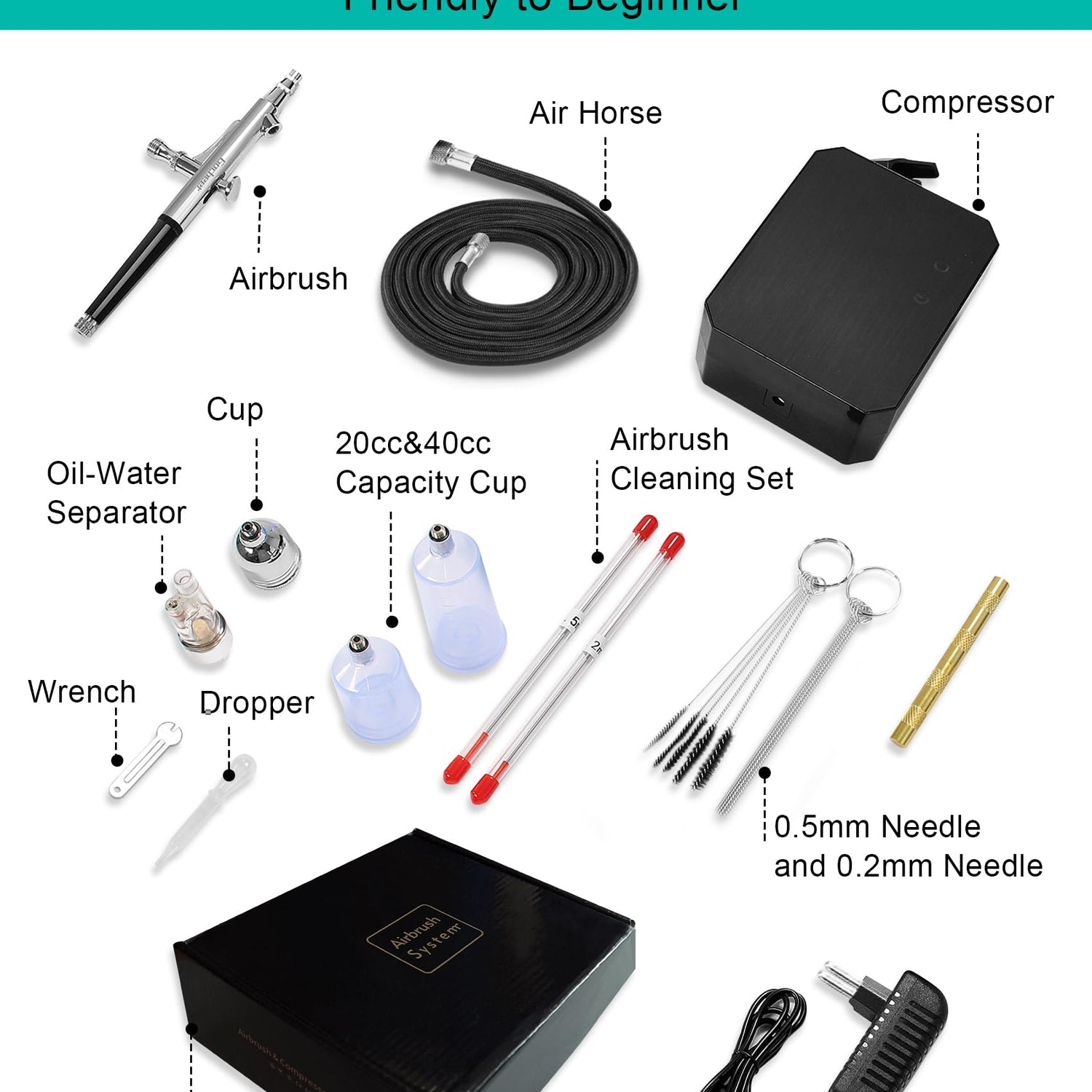 - Complete Air Brush Kit: Just one set to fulfill all your requirements. This comprehensive airbrush kit comes equipped with an oil-water separator, a complete cleaning kit, dismantle and installation tools, 20cc/40cc capacity cups etc.