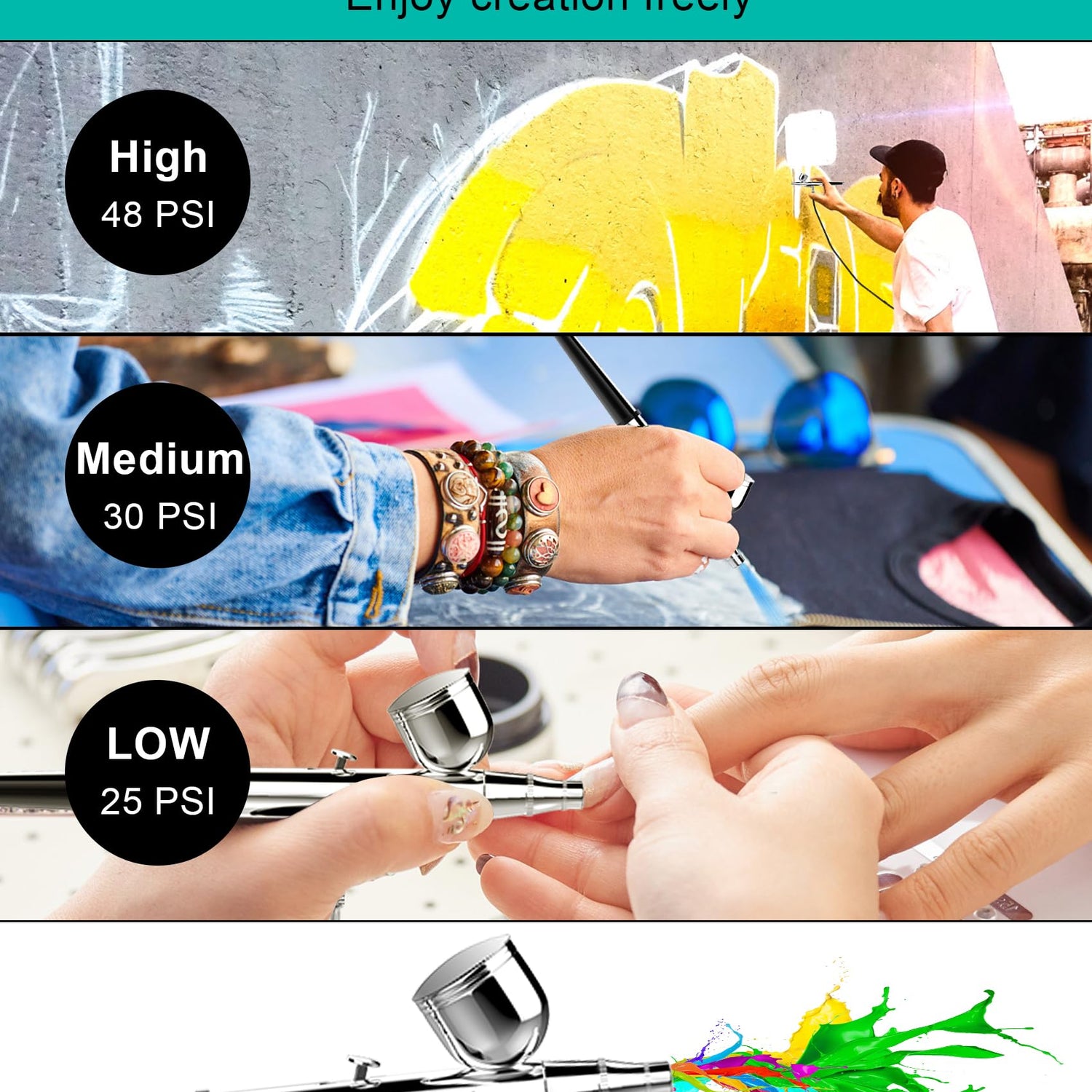 - 3-Gear Adjustable Air Pressure: airbrush provides 3 settings adjustment 25psi, 30psi, 40psi. Simply touch the airbrush kit with an air compressor button to freely adjust the air pressure accordingly, allowing your effortlessly achieve effects on artwork