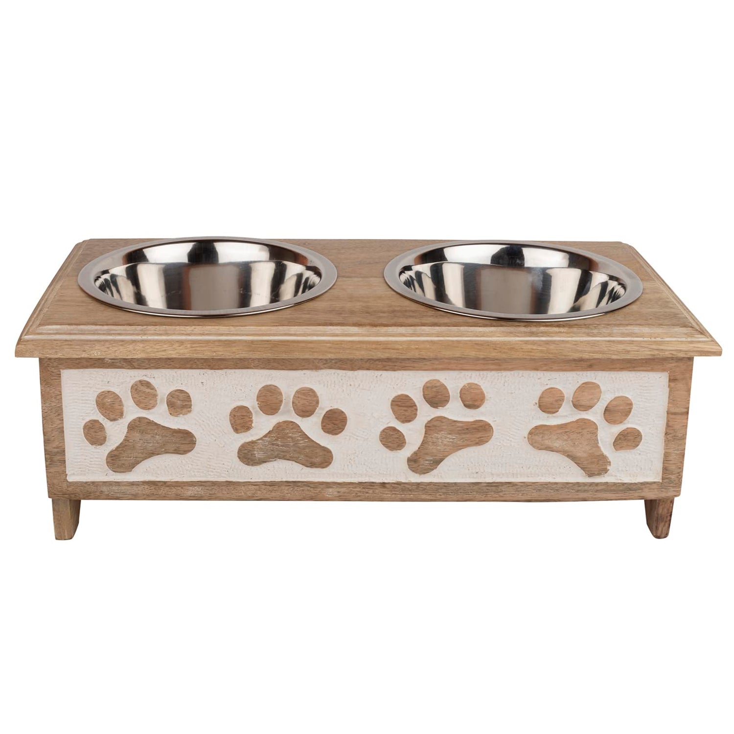 Details: GoCraft Raised Dog Bowls for Small Dogs | Modern Farmhouse White Washed Elevated Wooden Stand Feeder with 2 Stainless Steel Bowls for your Pet Food & Water