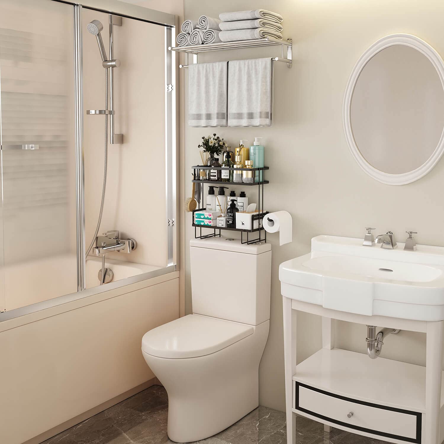 Godboat Bathroom Organizers and Storage, 2-Tier Over Toilet Storage, Bathroom Storage with 2 Hooks & Toilet Paper Holder, Wall Mounted Floating Shelves Furniture, Gifts for Women, Mothers Day (Black)