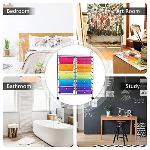 GOFLAME 15-Drawer Rolling Storage Cart, Multipurpose Movable Organizer Cart, Utility Cart for Home, Office, School, Rainbow