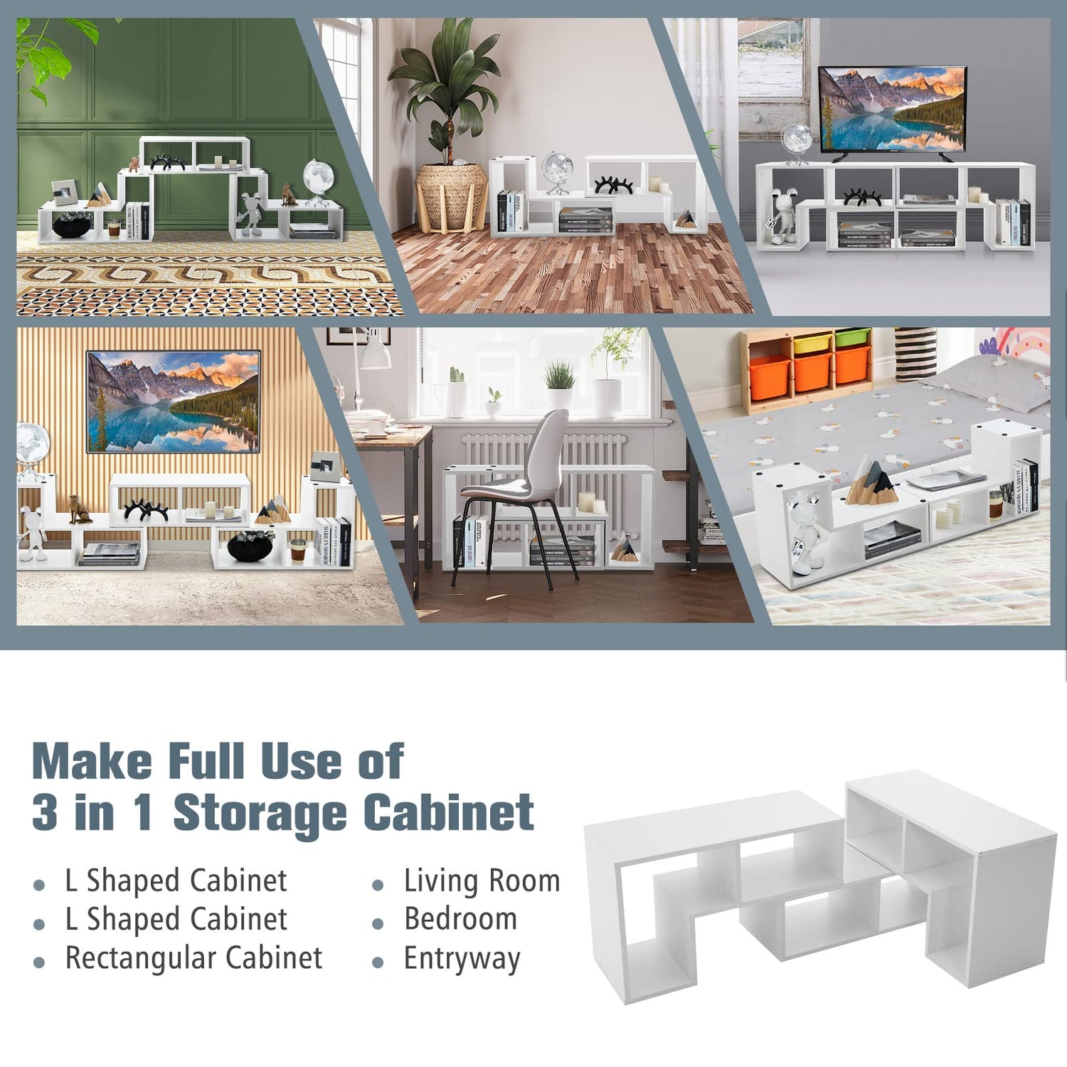 Let’s explore the endless possibilities of the 3 pieces TV console stand! The unit features free combinations, among which the most common 3 styles have been shown in the pictures. As the 2 L-shaped shelves are stacked on the rectangular one, they can be expanded or rotated to meet different needs. Therefore, you can use it as a low TV console table, a corner storage cabinet or a standing display shelf. Besides, the 6 diverse compartments offer an orderly storage solution to different electronics, books and other ornaments. What’s more, the well-constructed shelves are rather sturdy and durable, and non-slip pads are also included for strengthened stability. By the way, the entertainment center has a clean and minimalist appearance, with the screw holes covered by stickers.