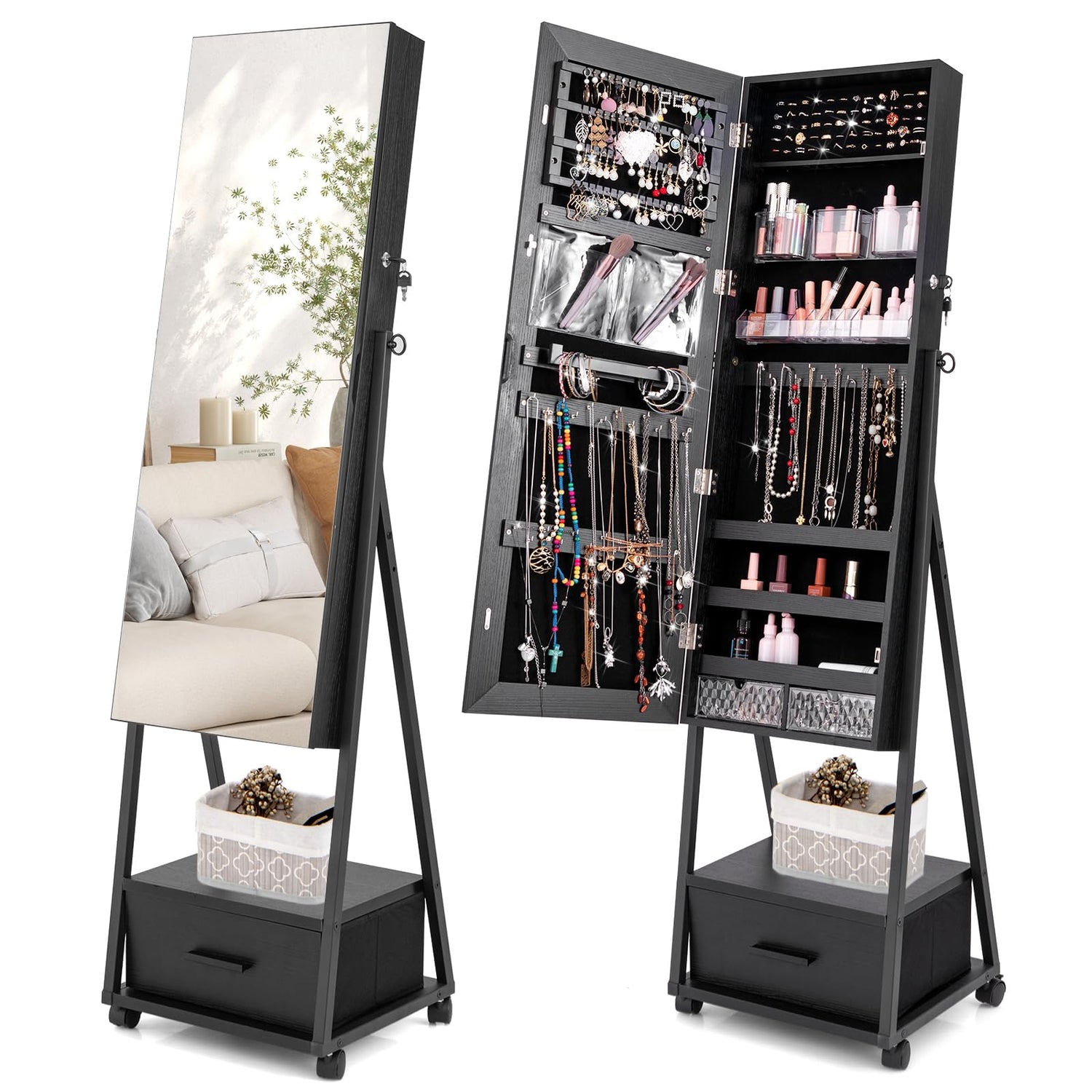 - [Multipurpose 3-in-1 Design]: Featuring a clear full-length mirror, this jewelry cabinet lets you check your ensemble from head to toe. Plus, the storage drawer, jewelry and cosmetics cabinet keep your precious accessories neatly organized.