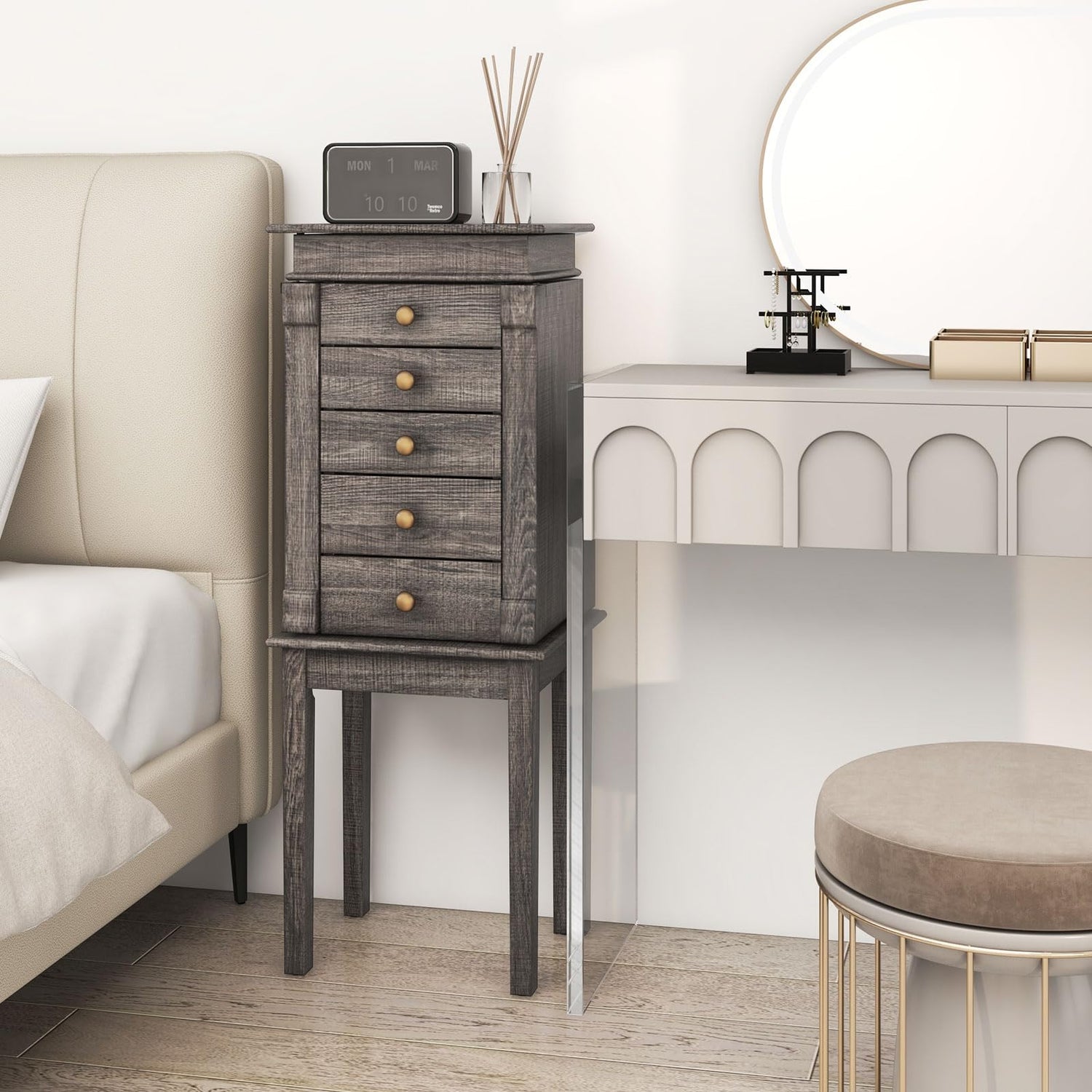 The standing jewelry armoire brings an ideal storage solution for your treasured jewelry. It comes with top tray, 5 drawers, 8 necklace hooks and 2 shelves to keep a variety of jewelry in order, and enables you to fetch them easily. Moreover, the flip top mirror is convenient for you to check your outfit. Supported by quality pine wood legs, the jewelry organizer is stable and durable. Plus, the elegant jewelry armoire cabinet is a perfect addition to your bedroom, dressing up room, etc.