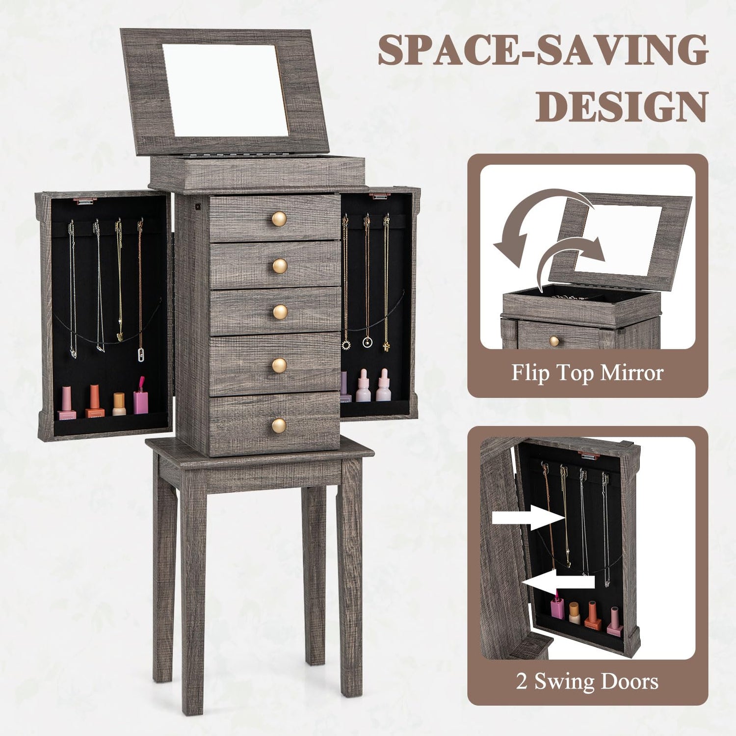 GOFLAME Standing Jewelry Armoire, Jewelry Storage Cabinet with Flip Top Makeup Mirror, 5 Drawers, 2 Side Doors, 8 Necklace Hooks, Solid Wood Legs,