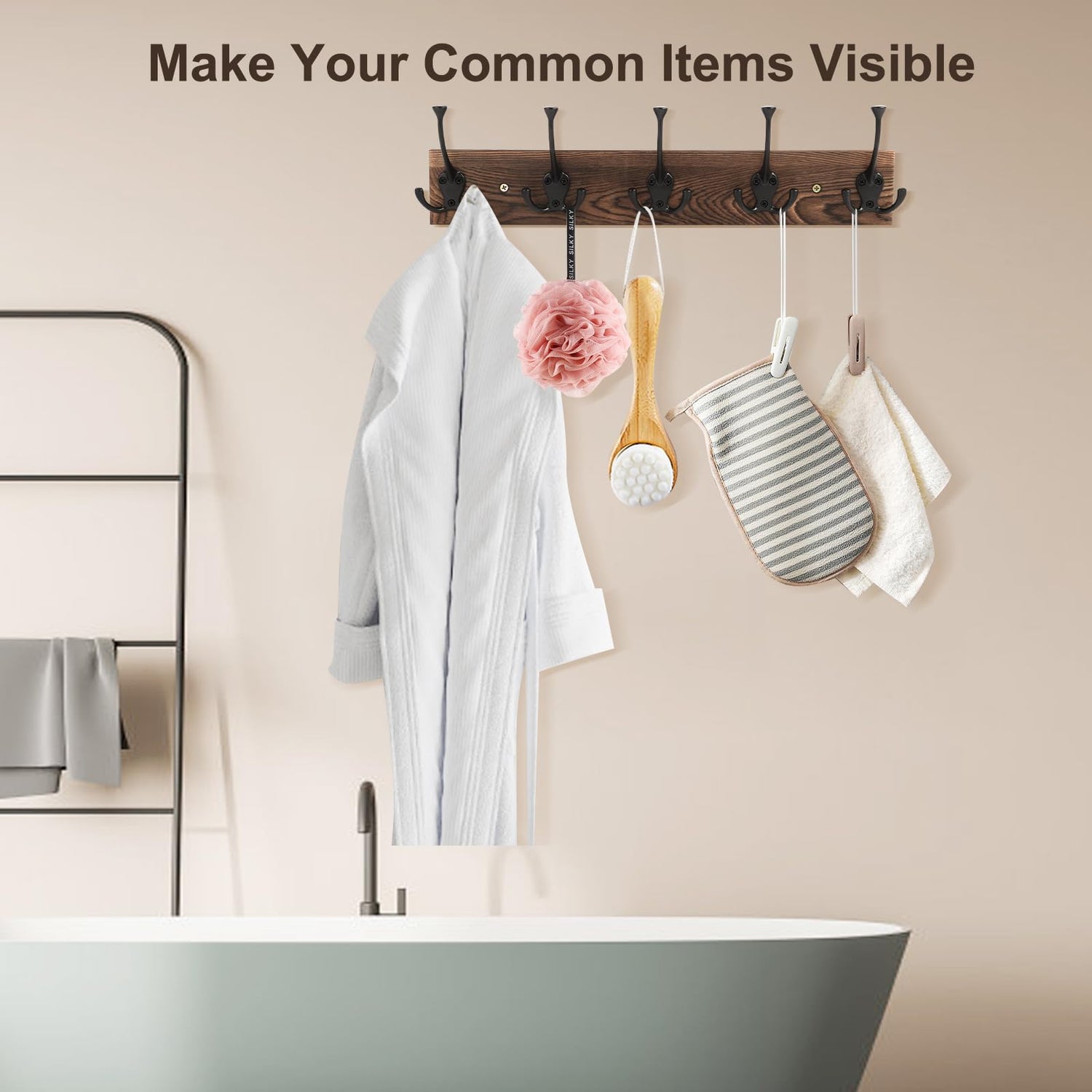 Gohiuo Rustic Wall Mount Coat Rack, 17" Coat Hooks Wall Mount Wood Coat Rack with 5 Triple Hooks, Heavy Duty Wooden Wall Mounted Coat Hanger for Entryway, Farmhouse Hanging Coats, Hats, Bags,Towels