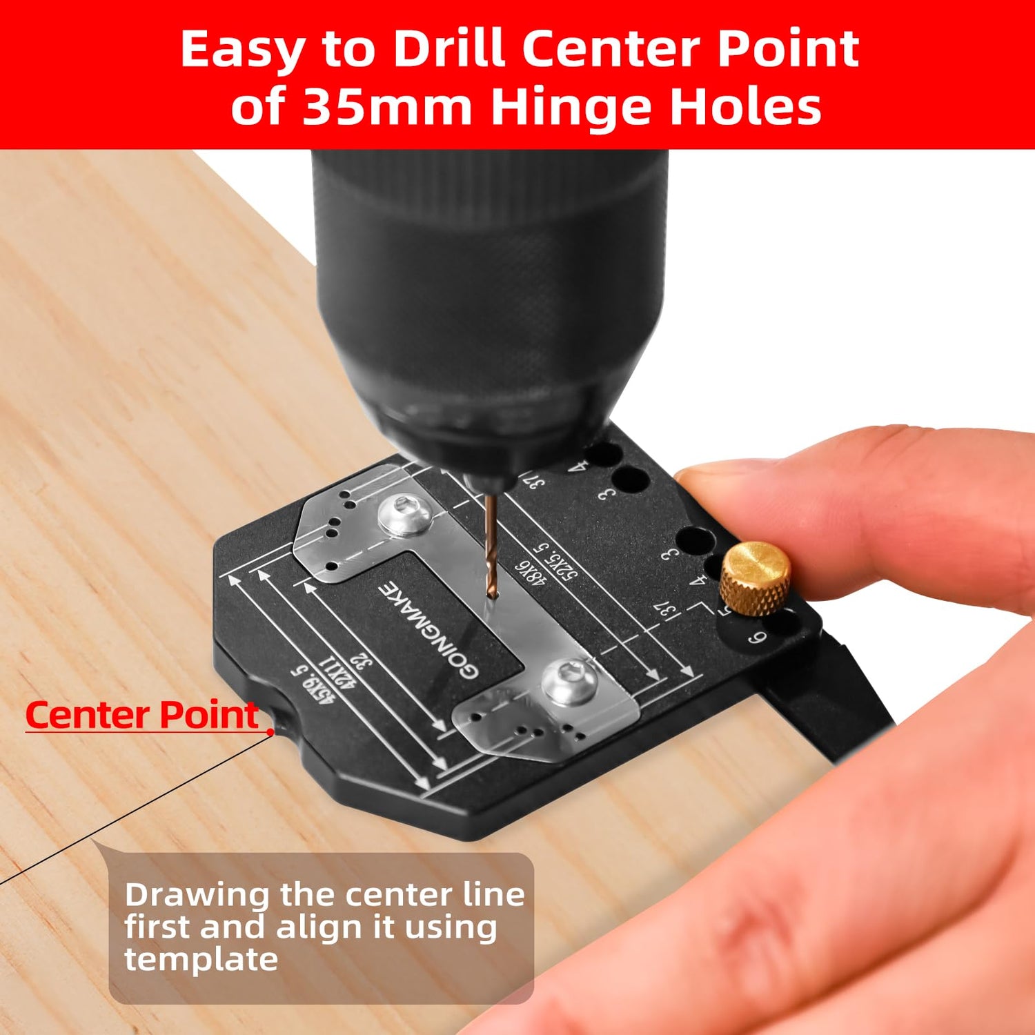 - 【Easy to Use】GOINGMAKE cabinet hinge jig is easy to use. Just draw the center line of 35mm hinge holes and hinge plate. Use the center point to align it, and you can use the small drill bit to drill the precision center hole of 35mm concealed hinge holes and hinge screw holes. Last you need to remove the teplate and drill the complete 35mm hinge hole with the 35mm drill bit without adjust depth stop.