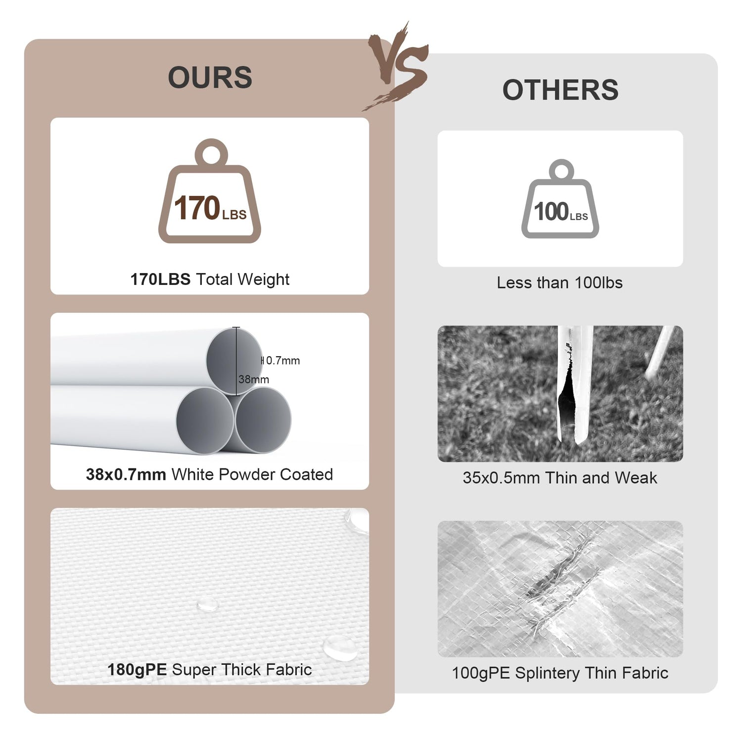- 【Heavy-duty Structure】Constructed with φ38mm galvanized steel pipes and a double-walled structure, our tent is built for durability. The 0.7mm thick rust-proof powder-coated frame can prevent debris, peeling, rusting, and corrosion, ensuring longevity. The triangular frame of the roof enhances stability. Elastic ball straps fix the canopy to the frame, and are also equipped with ground stakes and cables for installation on soft ground, providing additional support.